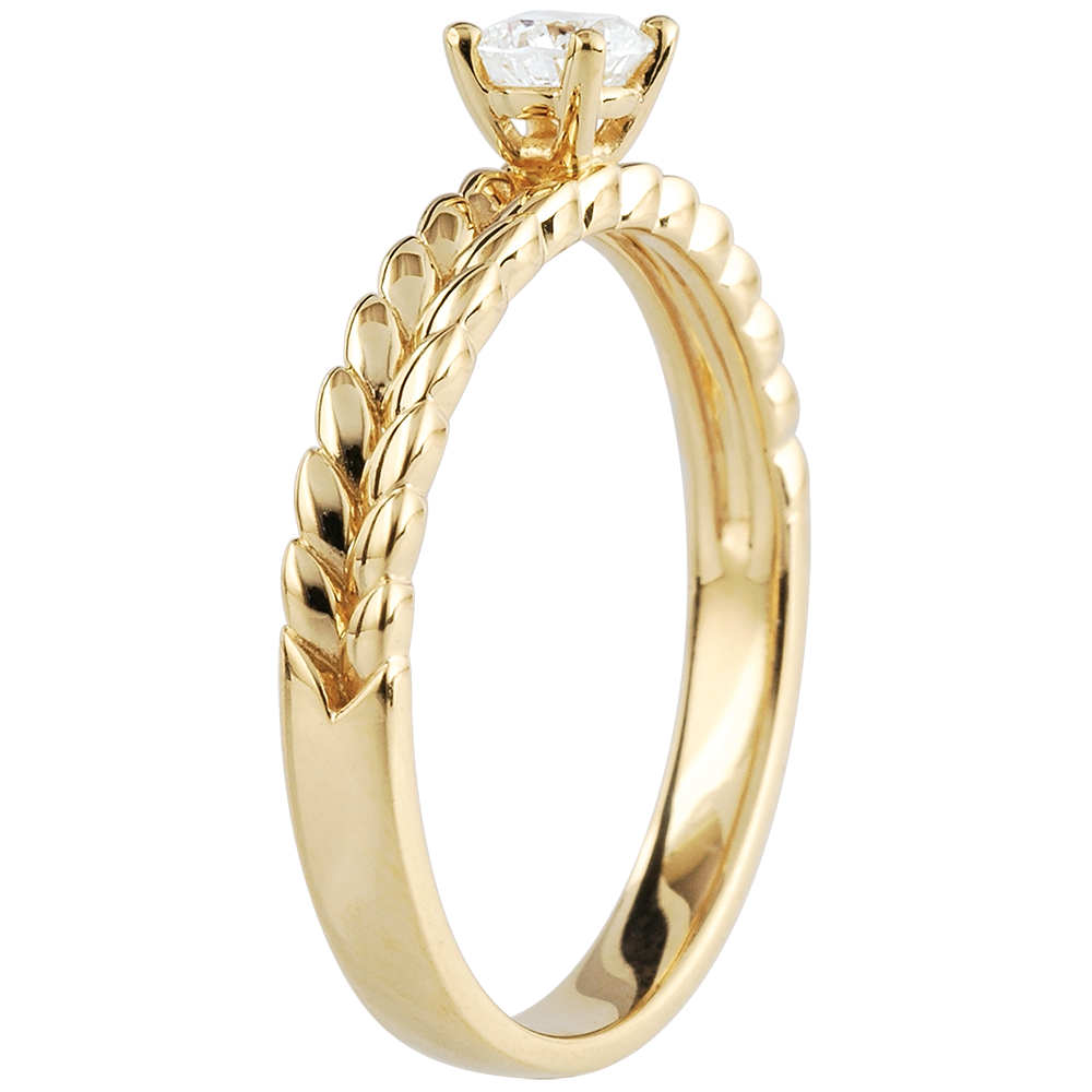 Un precioso diamente solitario que resposa sobre una montura de hojas de oro entrelazadas. Un anillo de compromiso original y refinado.