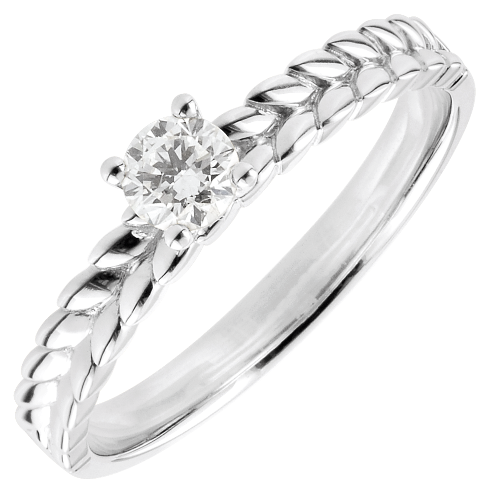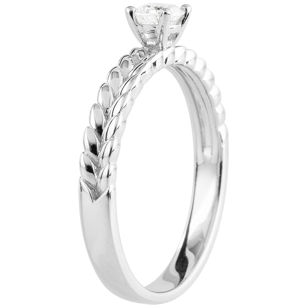 Un precioso diamente solitario que resposa sobre una montura de hojas de oro entrelazadas. Un anillo de compromiso original y refinado.