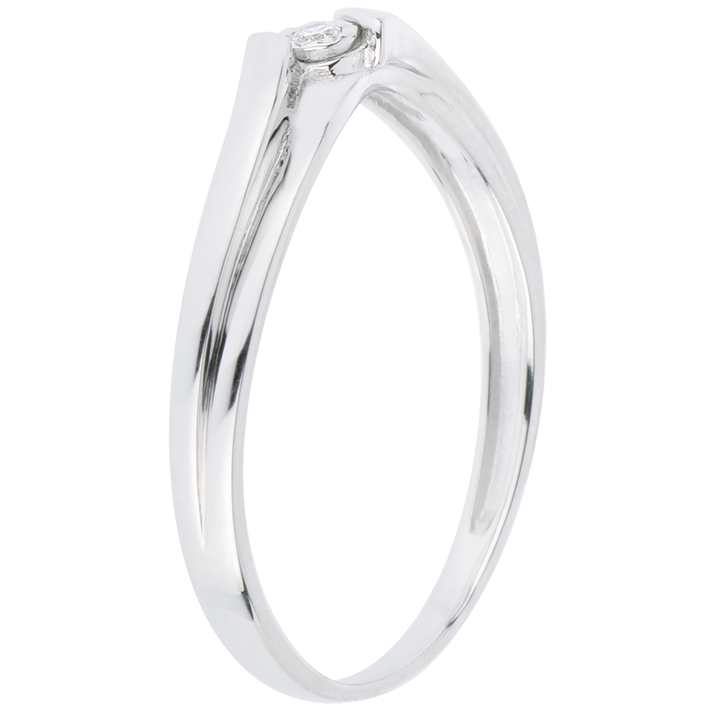 Un diamante solitario chispea encerrado en brazos de oro blanco como montura.
