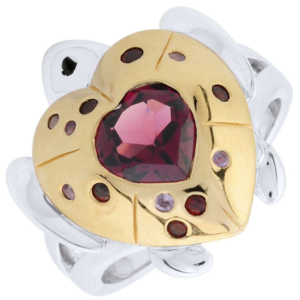 Esta tortuguita de amor tiene el caparazón recubierto de oro amarillo, un corazón del color del rubí rodeado de amatistas y de piedras granates. El corazón es una rodolita.…