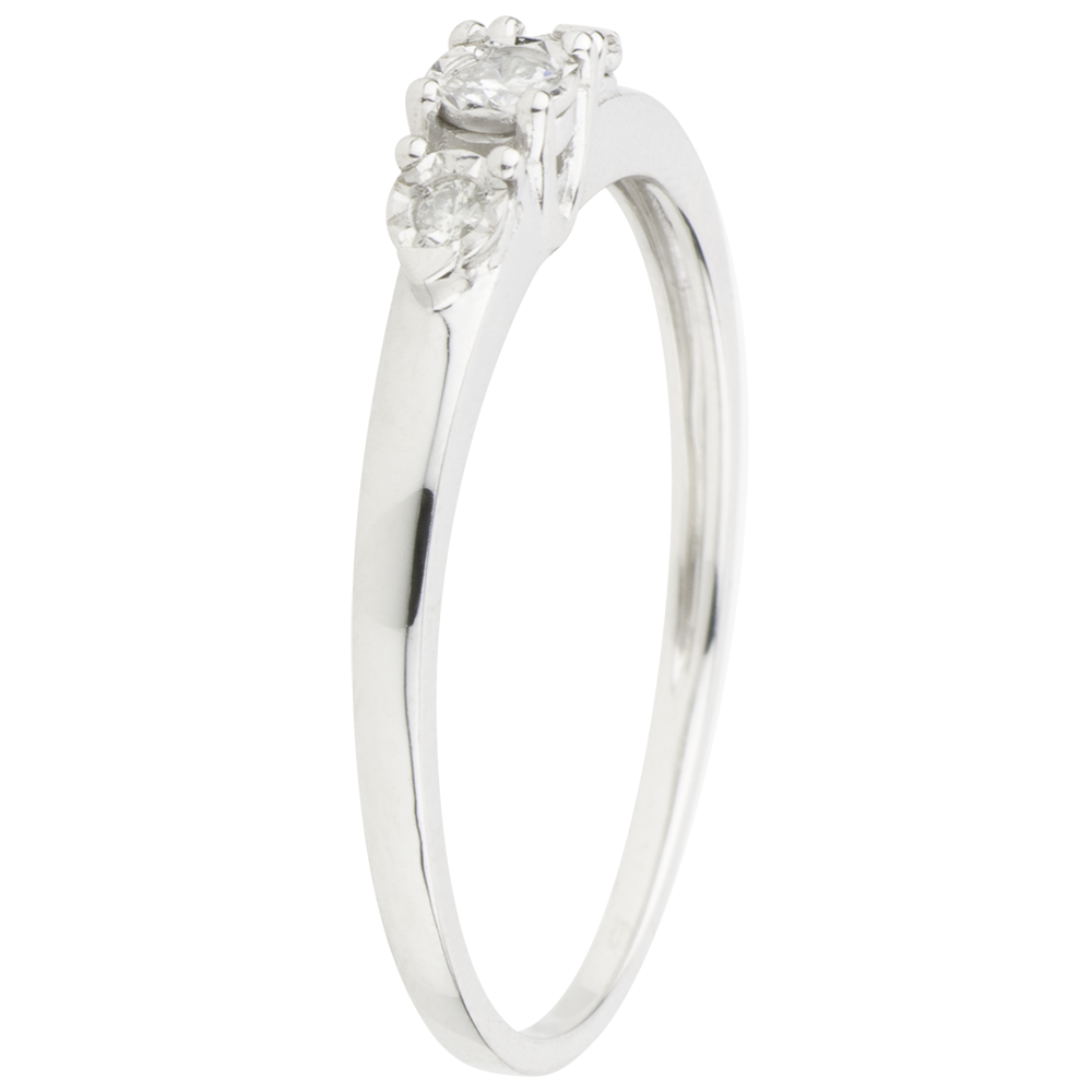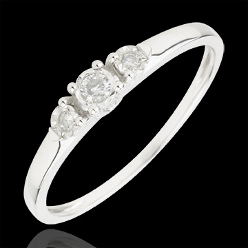 Una montura de oro blanco coronada por una trilogía de diamantes delicadamente rodeados de oro blanco.