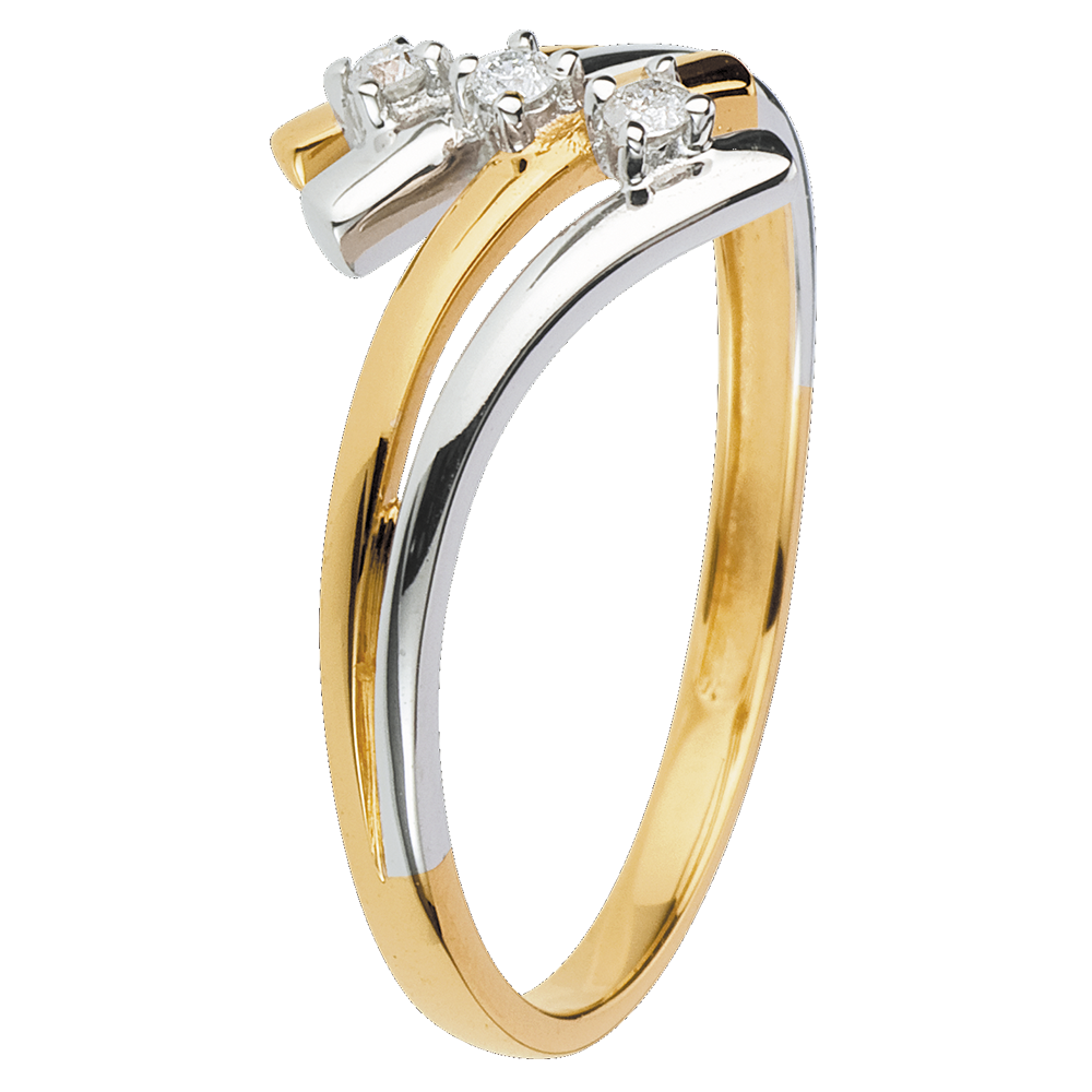 Una trilogía de diamantes montados sobre un aro de Oro Amarillo y abrazados por dos ondas de Oro Blanco.