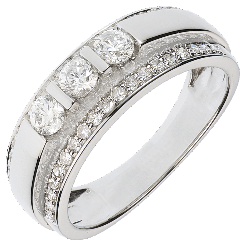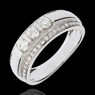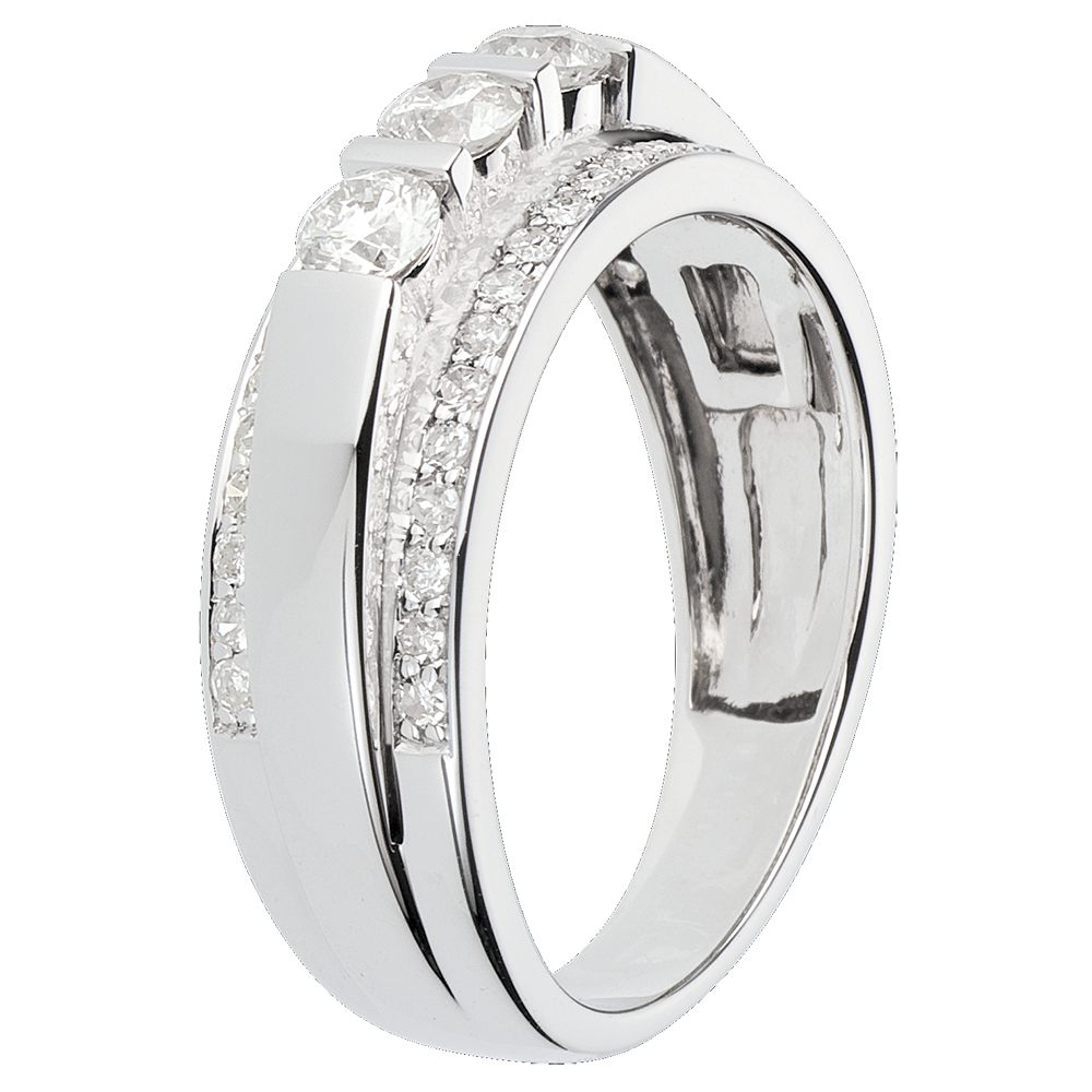 Un anillo que roza la perfección con un arco pavimentado, coronada por una trilogía de diamantes.