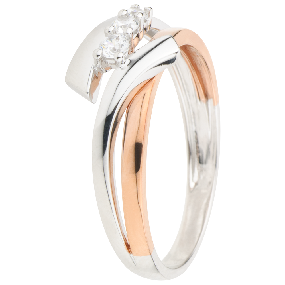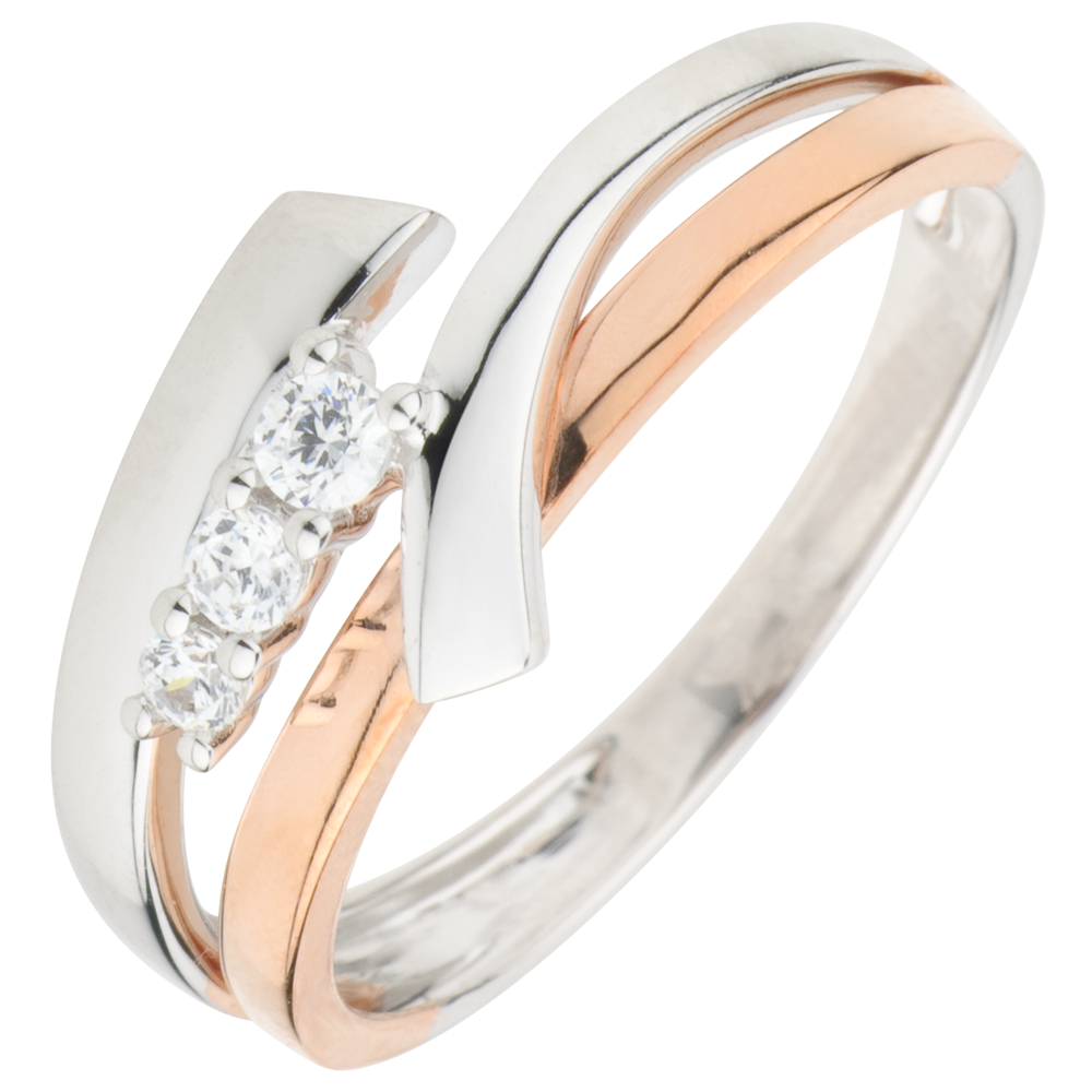 Una trilogía de diamantes une una cinta de oro posada sobre un aro de oro rosa para darle un toque de modernidad, color y elegancia.