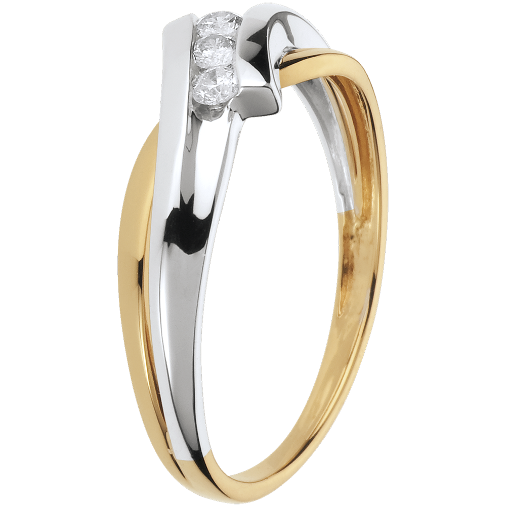 Una división de Oro Amarillo y Oro Blanco dan lugar a una montura armoniosa que cuenta con una trilogía de diamantes.