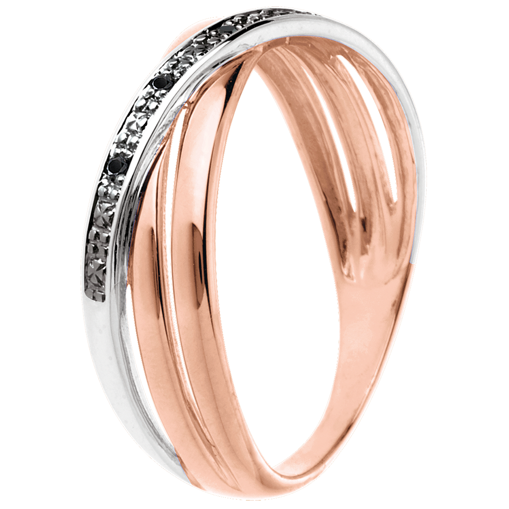 Una triple banda de oro rosa se cruza con una onda de oro blanco con 4 diamantes negros.