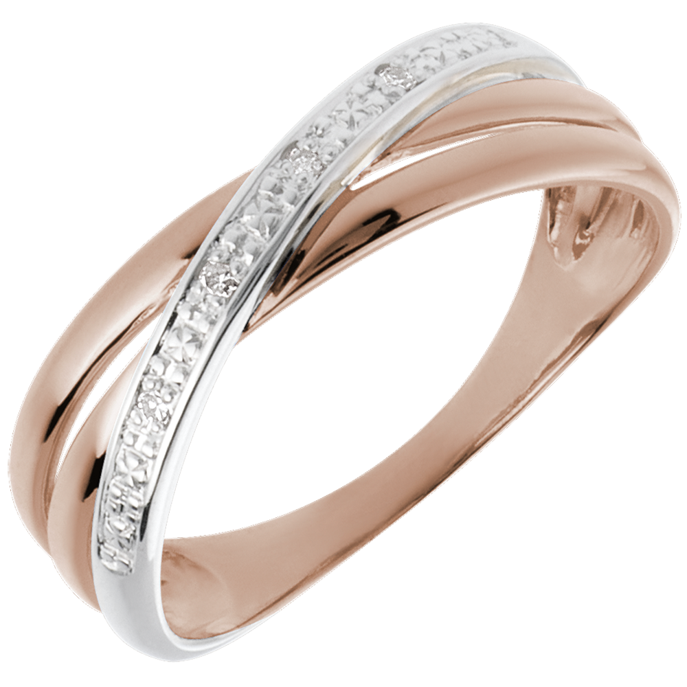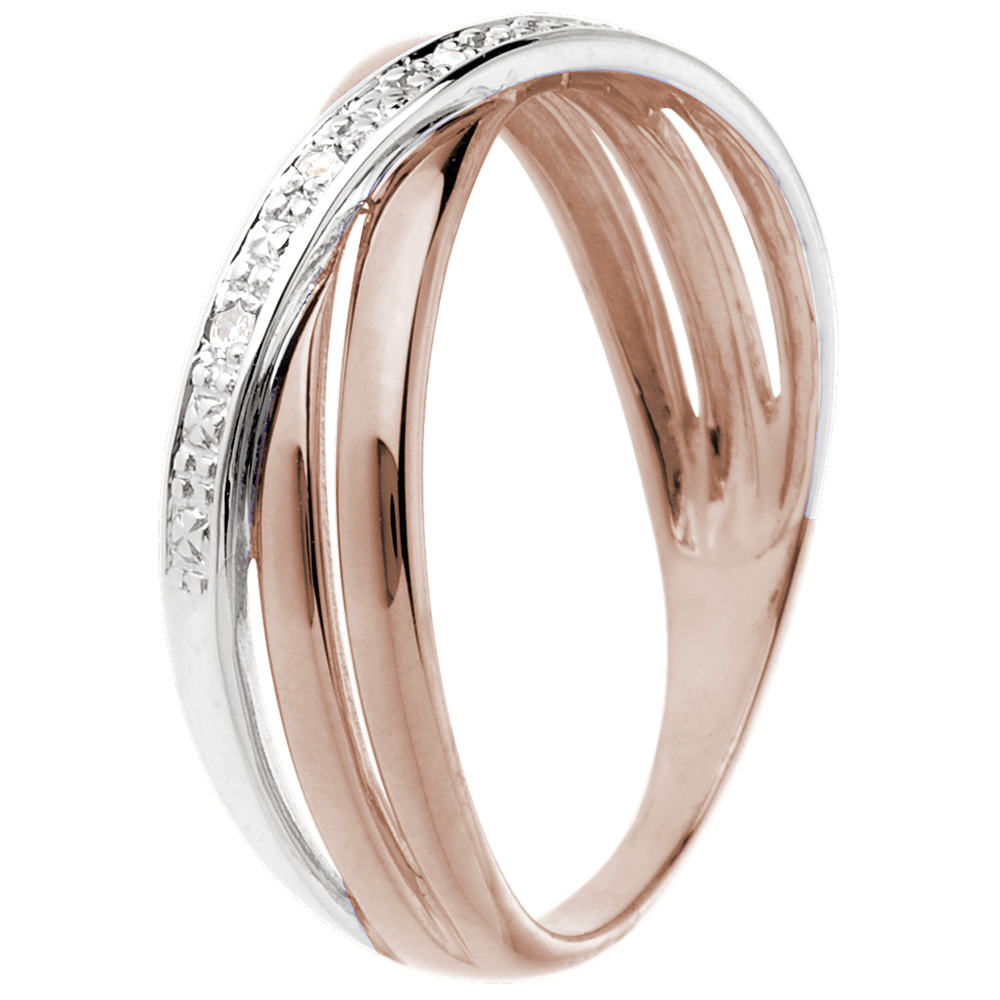Una montura de oro rosa, realzadas por un anillo de Oro Blanco salpicado por 4 diamantes.