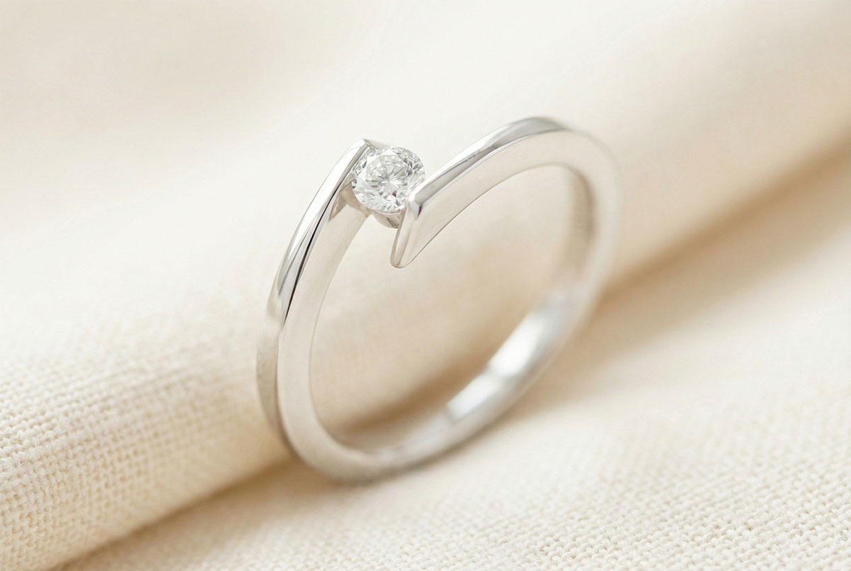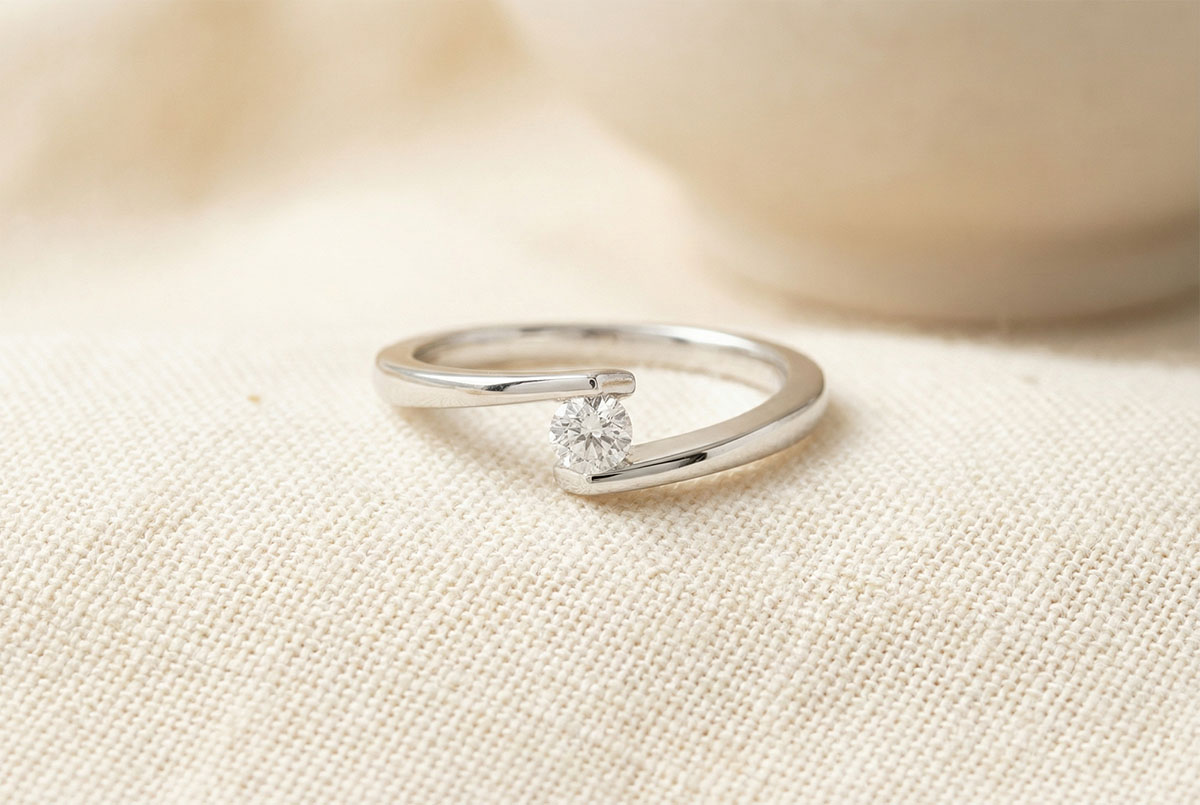 Un diamante solitario es enlazado en una montura sobria y moderna.