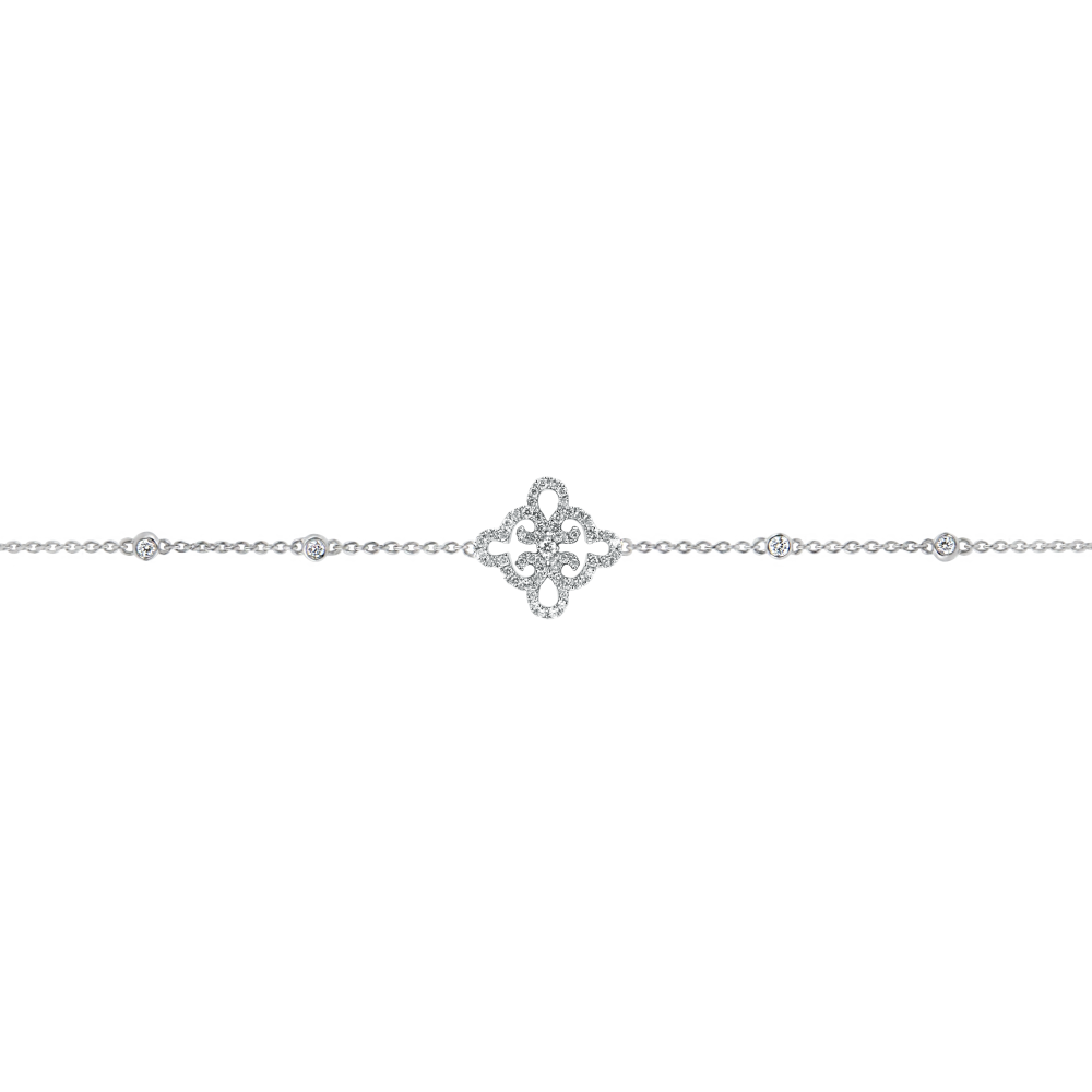 Brazalete delicado en oro blanco engastado con diamantes montados en una cadenita. Brazalete de tamaño ajustable: 18.5 cm, 17.5 cm, 16.5 cm.