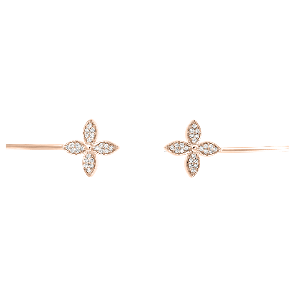 Un elegante Brazalete junco de oro rosa cerrado por dos tréboles con incrustaciones de relucientes diamantes. Un dulce y fresco amuleto de la suerte.