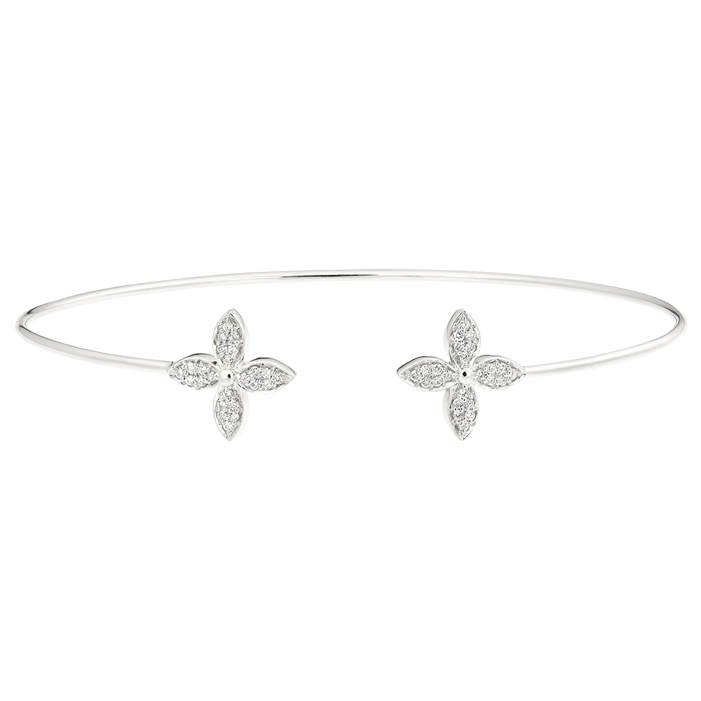 Un elegante Brazalete junco de oro blanco cerrado por dos tréboles con incrustaciones de relucientes diamantes. Un dulce y fresco amuleto de la suerte.