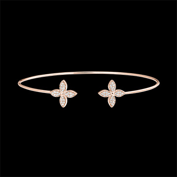 Un elegante Brazalete junco de oro rosa cerrado por dos tréboles con incrustaciones de relucientes diamantes. Un dulce y fresco amuleto de la suerte.