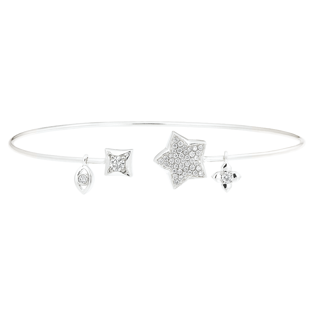 Un Brazalete junco de oro blanco adornado con colgantes de diamantes y amuletos de la suerte.