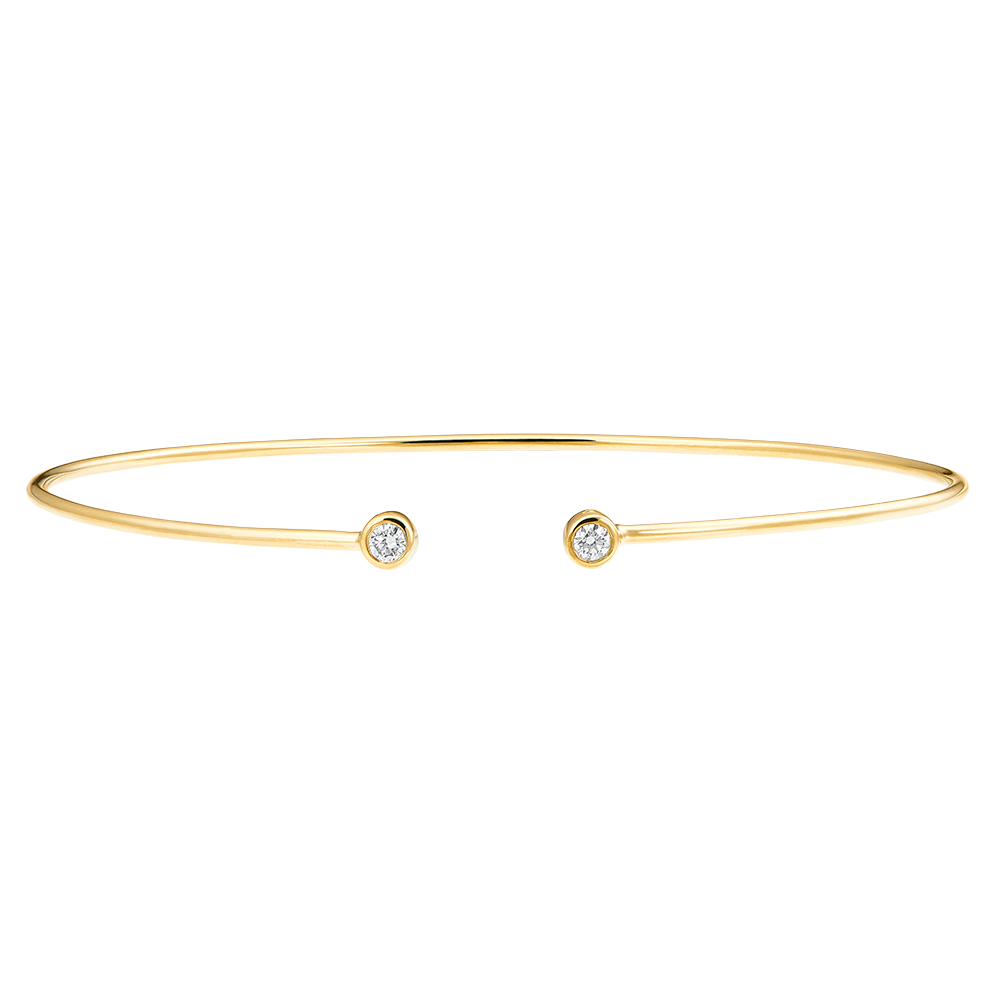 Un Brazalete de junco, fino y elegante, adornado con dos delicados diamantes. Para llevar solo o apilado con la versión en oro blanco y rosa.