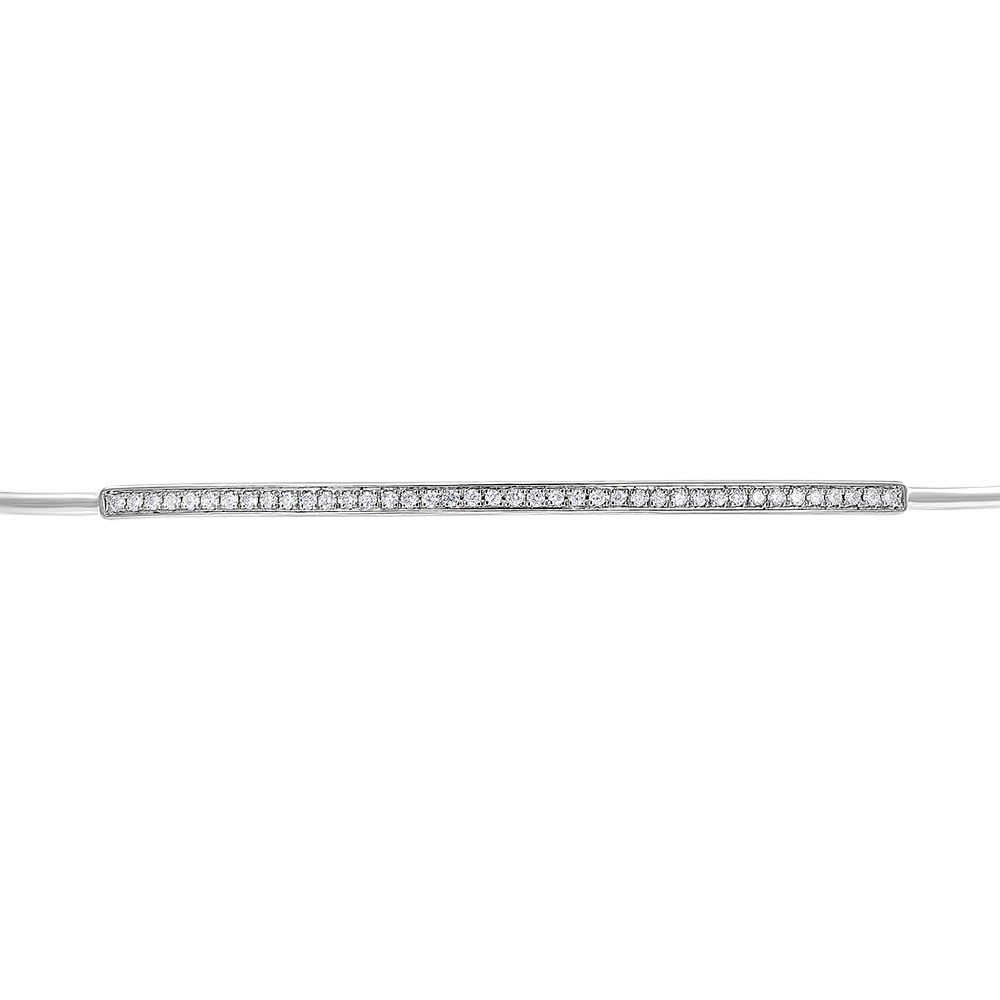 Un delicado junco de oro blanco engastado con una pléyade de 40 diamantes para iluminar la muñeca. Brazalete con cierre de cadena para mayor comodidad.