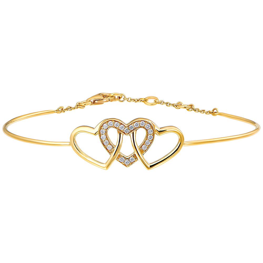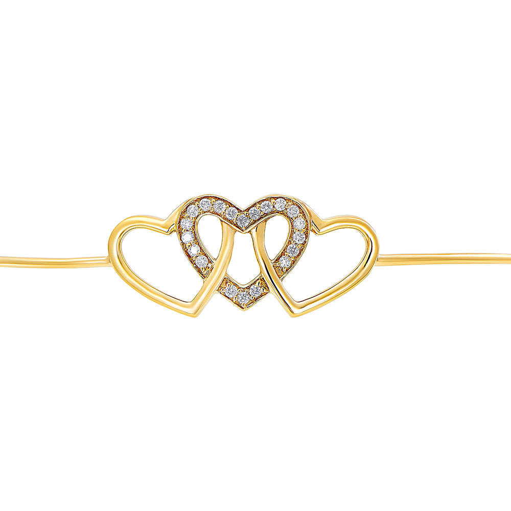 Un Brazalete de junco en donde el trío de corazones se entrelaza con delicadeza, ternura y encanto, en oro amarillo y recubierto de diamantes. Brazalete con cierre de cadena para mayor comodidad.