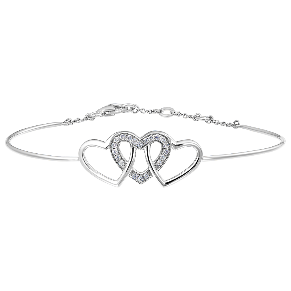 Un Brazalete de junco en donde el trío de corazones se entrelaza con delicadeza, ternura y encanto, en oro blanco y recubierto de diamantes. Brazalete con cierre de cadena para mayor comodidad.