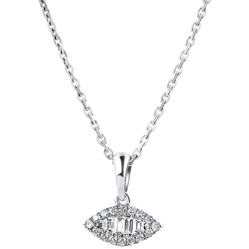 Una trilogía de diamantes estilo baguette, resaltados por una capa fina, dando como resultado un colgante con formas inspiradas en las historias de oriente.