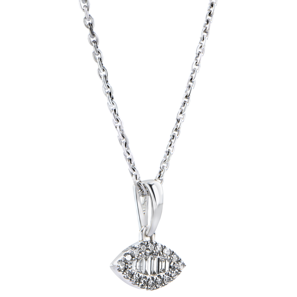 Una trilogía de diamantes estilo baguette, resaltados por una capa fina, dando como resultado un colgante con formas inspiradas en las historias de oriente.