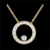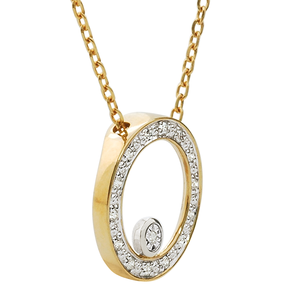 Un círculo de oro con incrustaciones de diamantes, con un diamante rodeado por un círculo de oro amarillo suspendidos en una cadena de oro amarillo. Atemporal y elegante para cualquier ocasión.