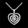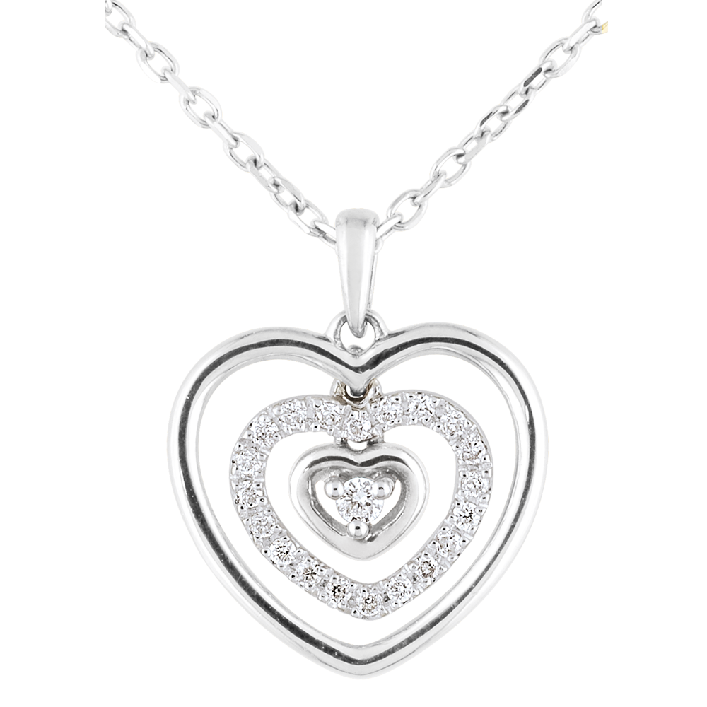 Una trilogía de corazones colgando en el abismo y móviles consiste en dos corazones de oro blanco, un corazón de oro blanco adoquinado de diamantes y un diamante central sujeto por un chatón abierto.