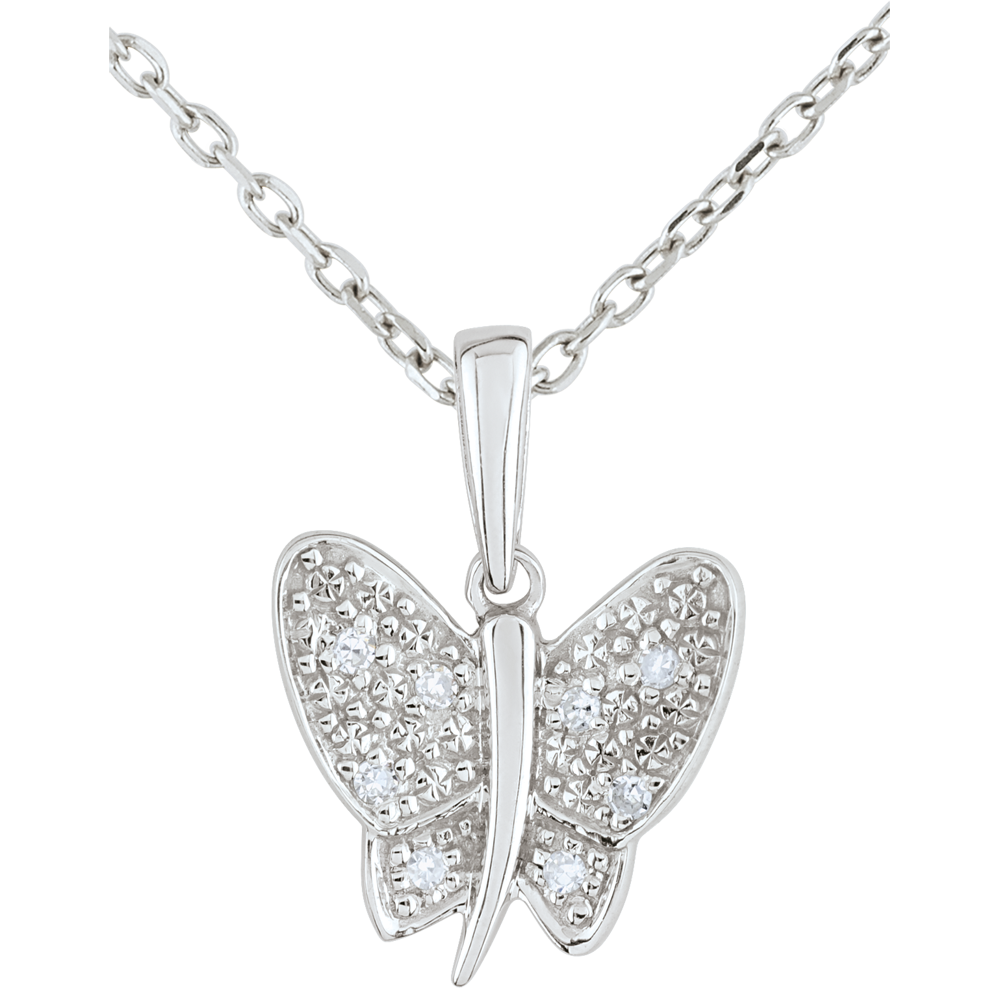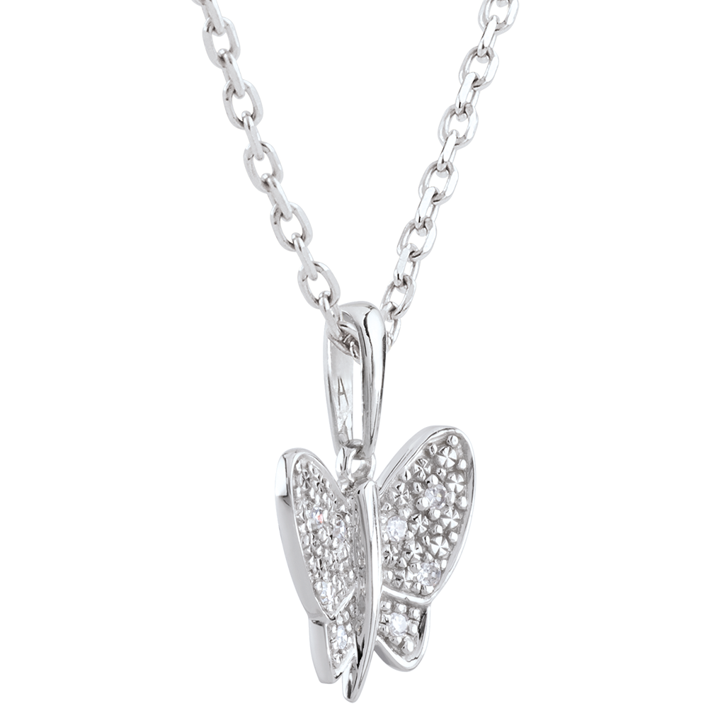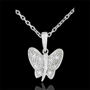 Una delicada mariposa de oro y diamantes cuyos destellos se mueven al unísono con los movimientos de la persona una vez suspendida en su cuello.