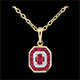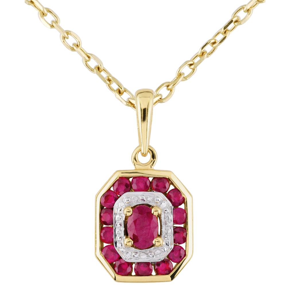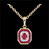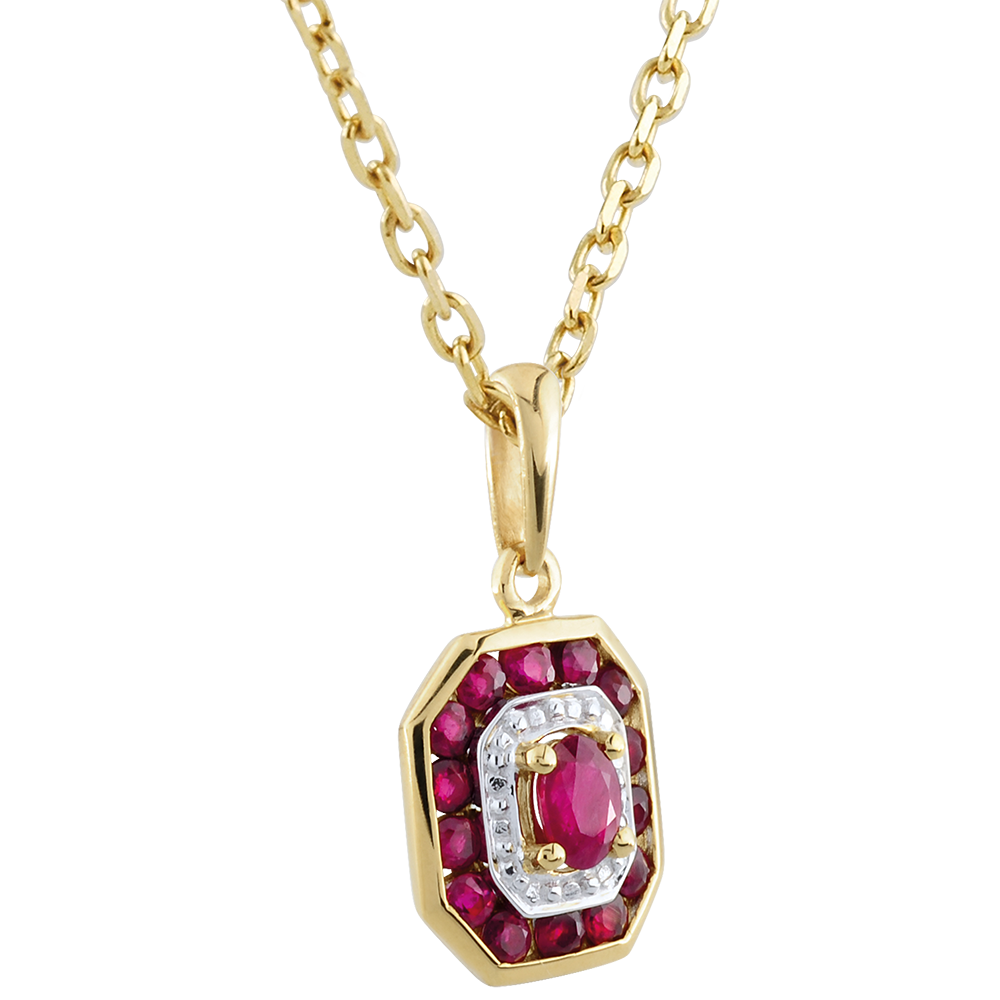 Un octógono de oro amarillo con incrustaciones de rubíes y de oro blanco presenta la forma del diamante. En el centro, un rubí oval culmina el colgante. Una joya elgante e aterporoal.