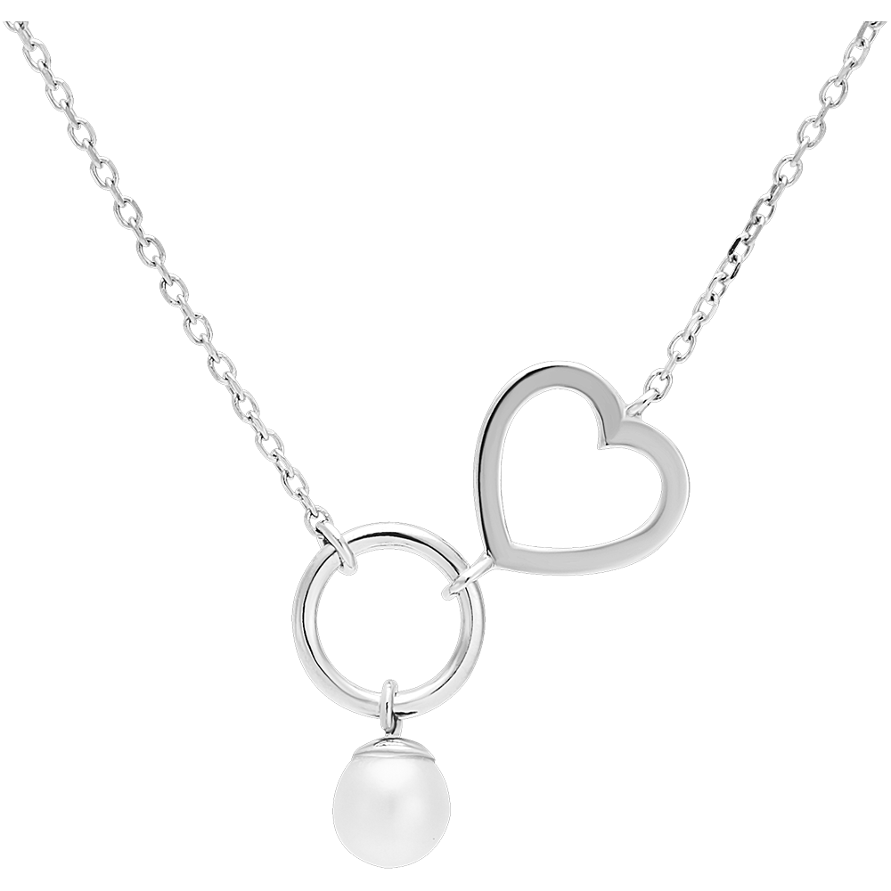 Un collar de oro blanco adornado con un anillo, una perla y un colgante de corazón, para un diseño lleno de movimiento y ligereza.