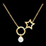 Este collar en oro amarillo de 9 quilates está adornado con un anillo, una perla y un colgante en forma de estrella.