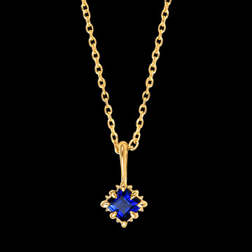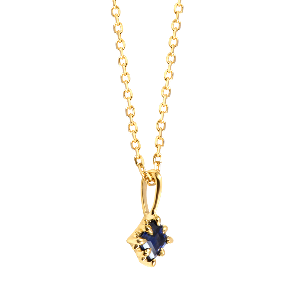 Un zafiro sintético azul intenso suspendido en un diseño minimalista de oro amarillo de 9 quilates. Este collar fino representa la elegancia sutil en el escote.