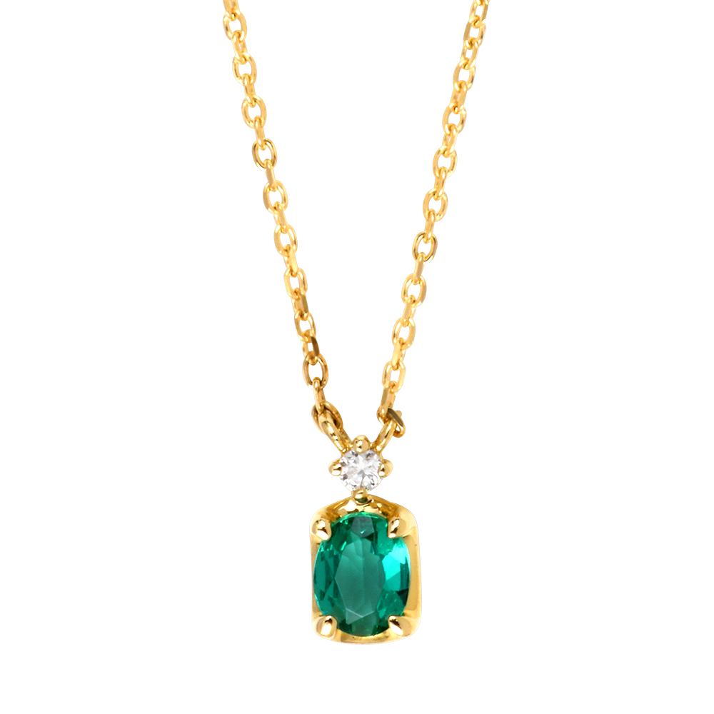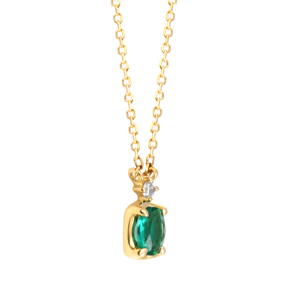 El collar presenta una esmeralda sintética de calidad Very Good y un diamante sintético certificado GSI, que garantizan color vivo, buena pureza y brillo duradero.