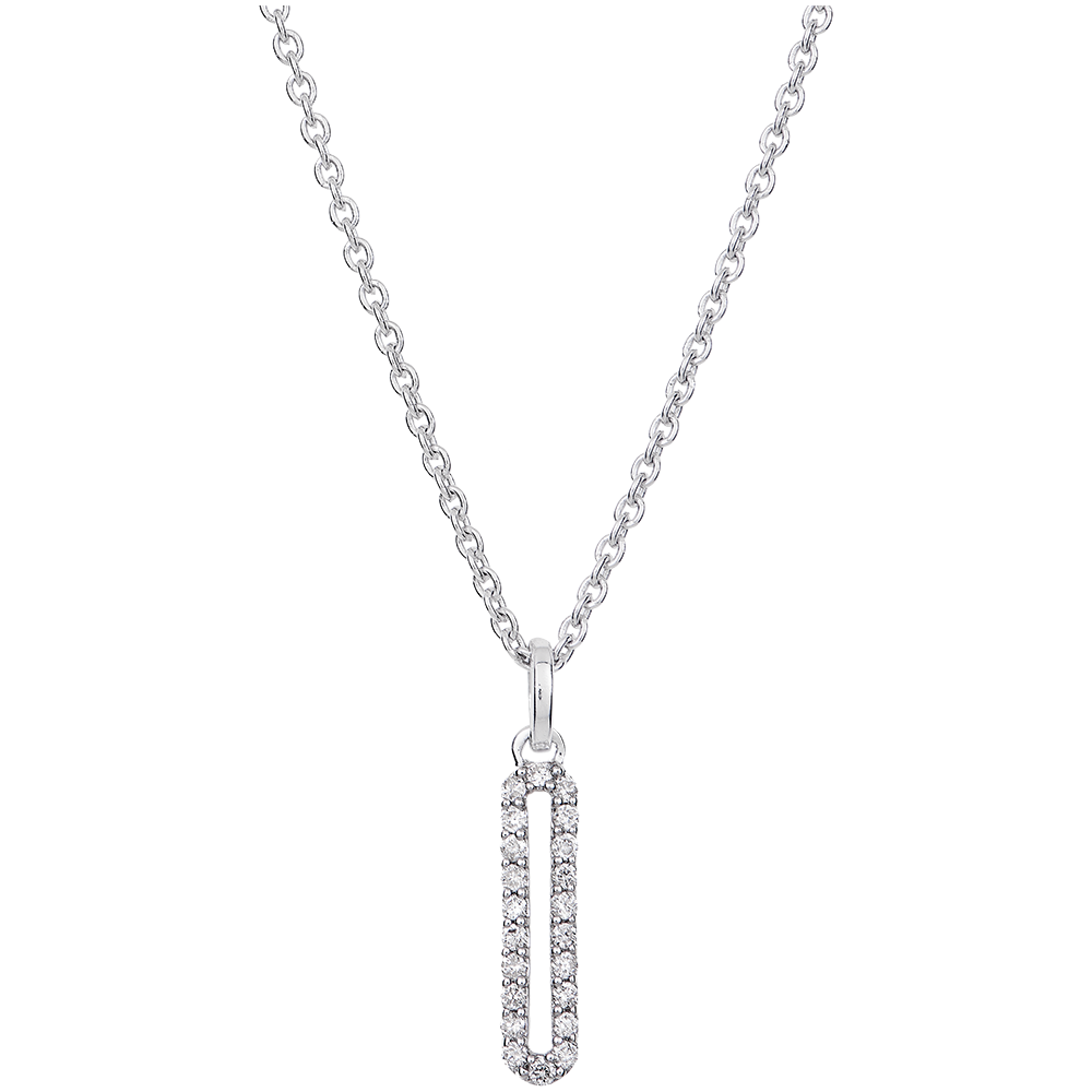 Un collar en forma ovalada en una versión minimalista y calada, con los contornos empedrados en diamantes. Una joya completamente delicada y depurada.