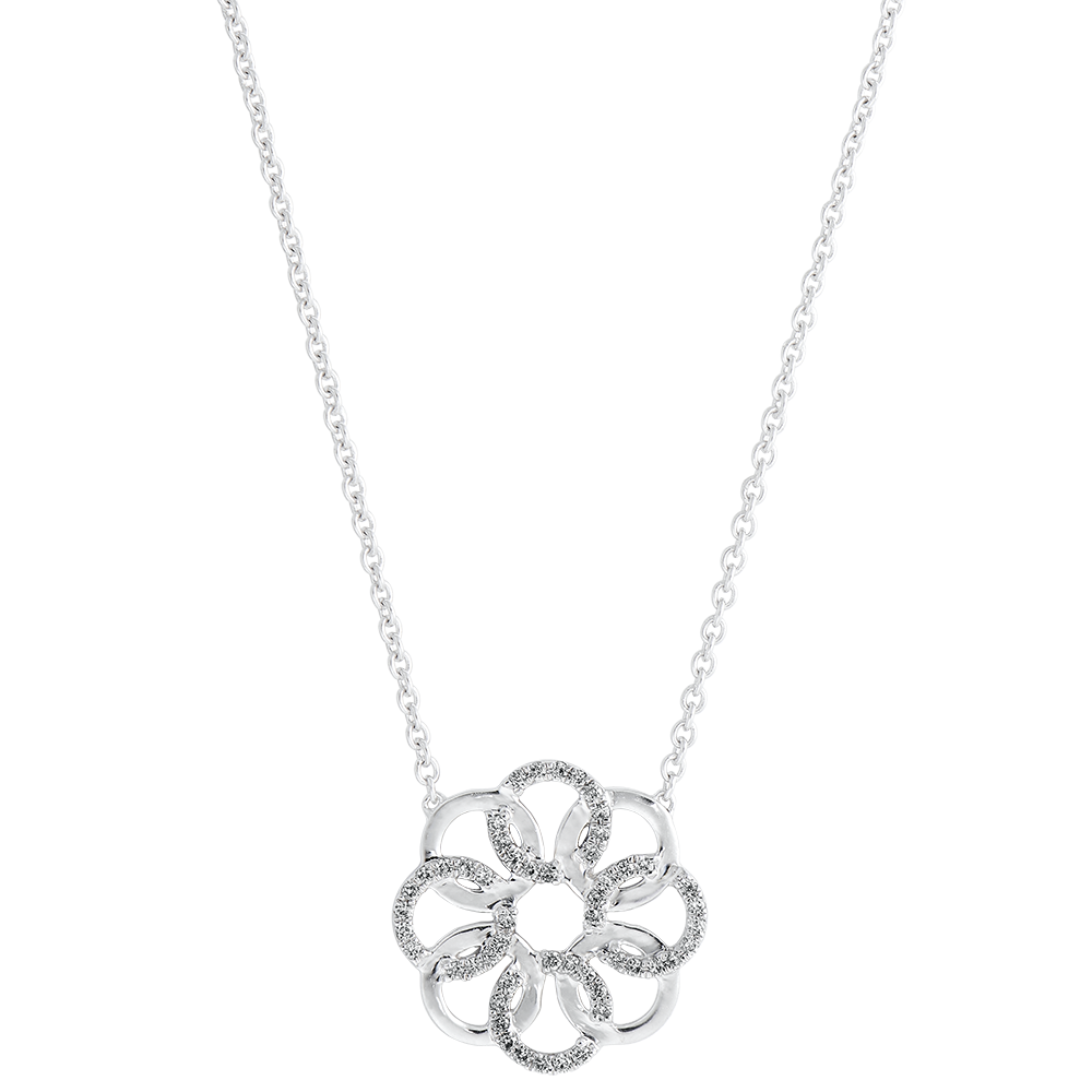 Recubierta caleidoscópica y curvas sinuosas para un collar de oro blanco creativo y refinado. Con cadena de 45 cm de largo y argolla de ajuste a 42 cm.