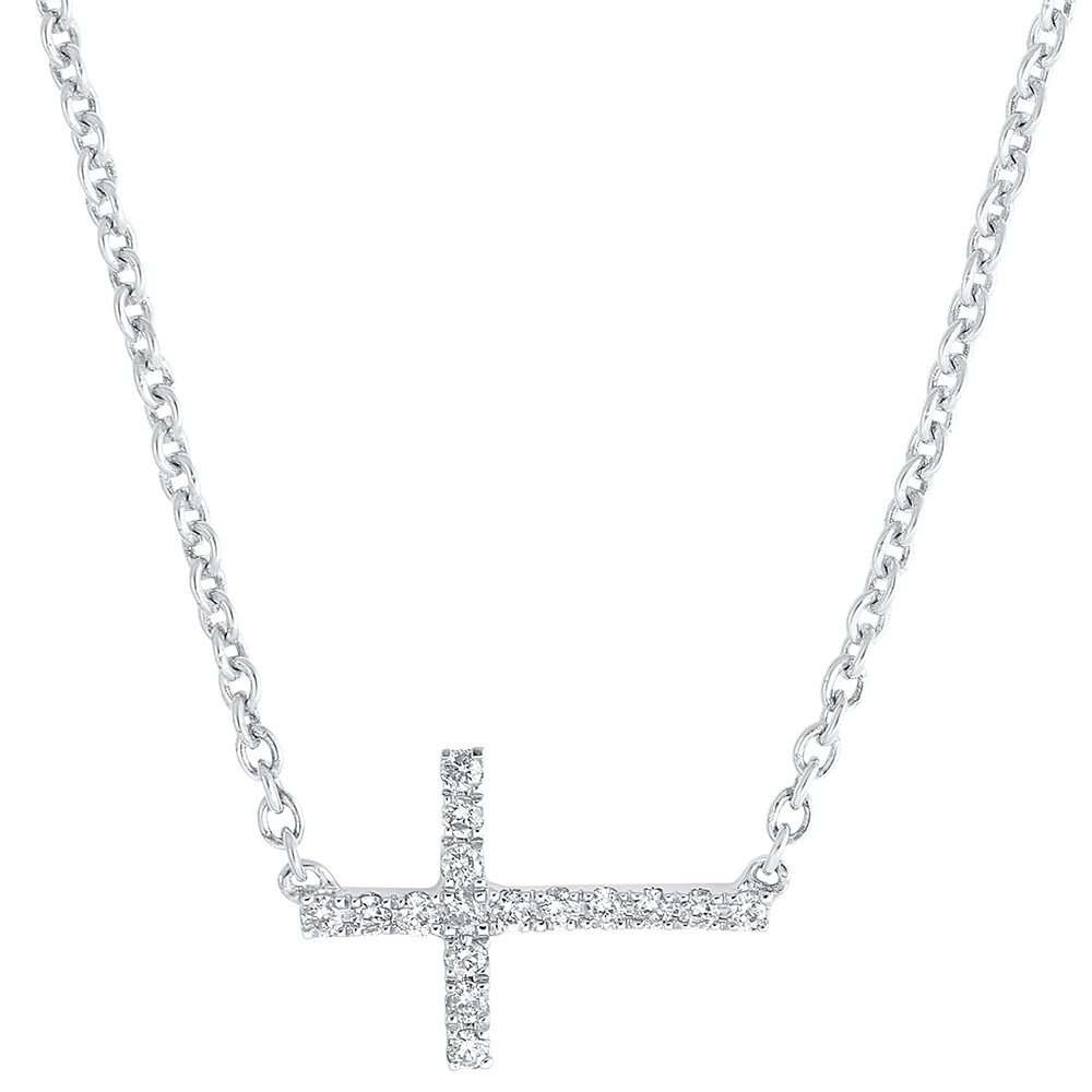 Un imprescindible collar con cruz de oro blanco, de proporciones finas y delicadas, se sublima con un meticuloso recubrimiento de diamantes montado en una cadena. Con longitud de cadena de 45 cm y una argolla de ajuste a 42 cm.