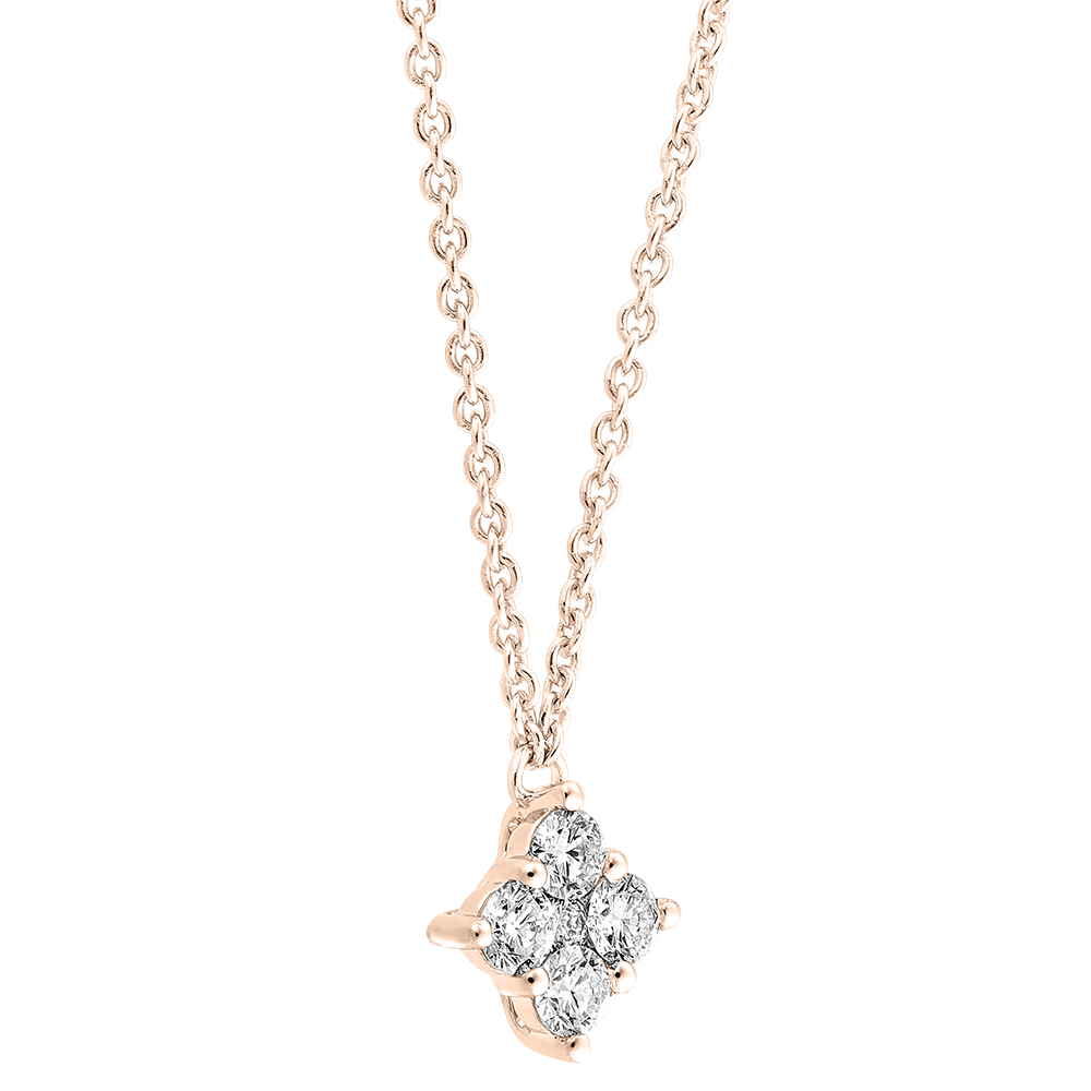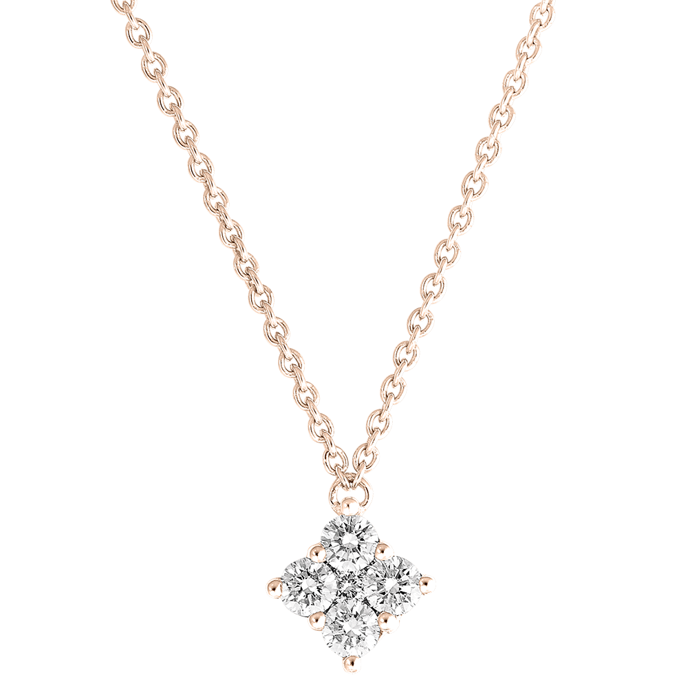 Un collar de oro rosa semi cubierto con diamantes, cuyo colgante engastado con un cuadrado de 5 diamantes añade un toque precioso y moderno al mismo tiempo. Con una longitud de cadena de 45 cm y una argolla de ajuste de 42 cm.