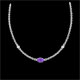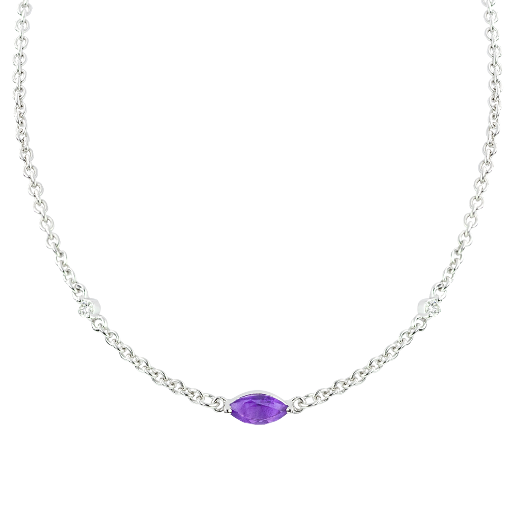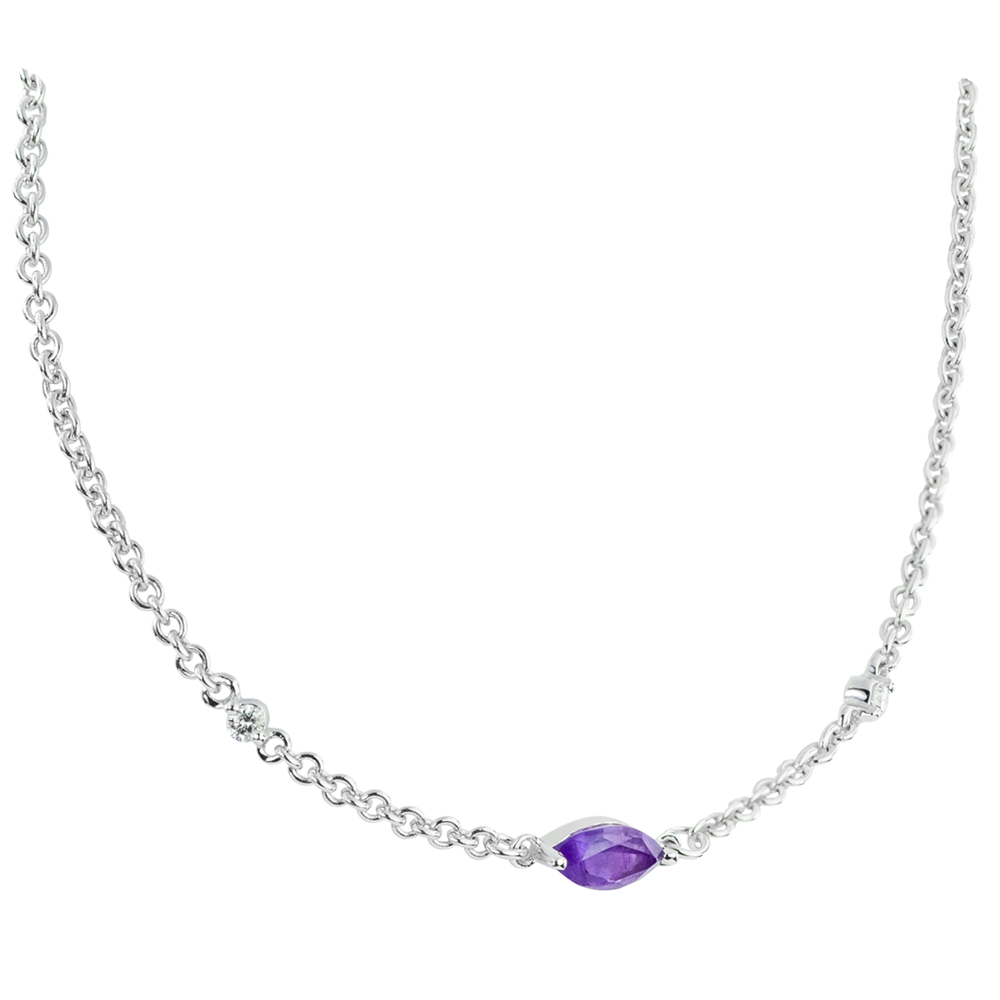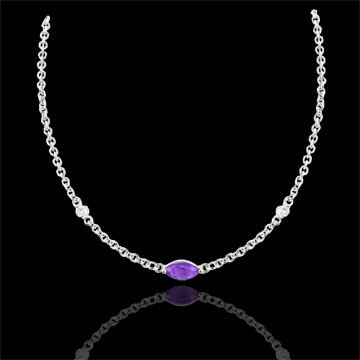 La preciosa pupila simbolizada por un amatista de corte marquesa coronado en el centro de esta fina cadena de oro blanco. Está rodeado por dos diamantes magníficos como dos lágrimas congeladas para siempre.