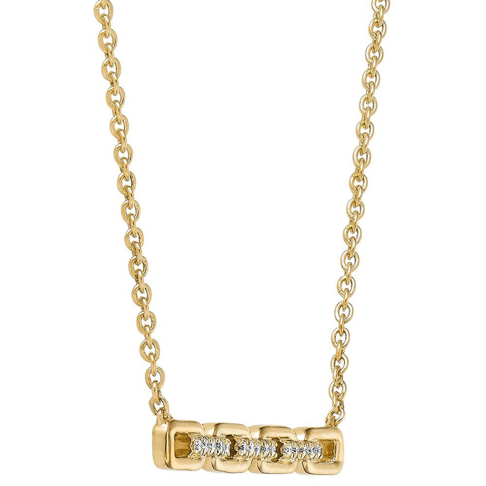 Cuatro eslabones cubanos grandes, engastados con diamantes contrastan con una delicada cadena para un clásico collar de oro amarillo rediseñado. Con una cadena de 45 cm de largo y una argolla de ajuste de 42 cm.