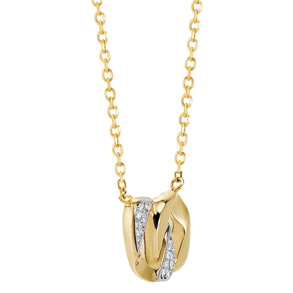 Dúo de argollas delicadas de oro amarillo y recubiertas de diamantes se colocan en una cadenita delicada dando como resultado un collar clásico renovado. Con una cadena de longitud de 45cm y un anillo para ajuste de 42cm.