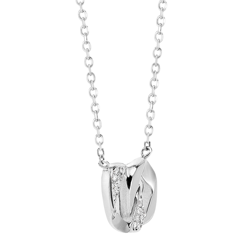 Dúo de argollas delicadas de oro blanco y recubiertas de diamantes se colocan en una cadenita delicada dando como resultado un collar clásico renovado. Con una cadena de longitud de 45cm y un anillo para ajuste de 42cm.