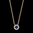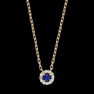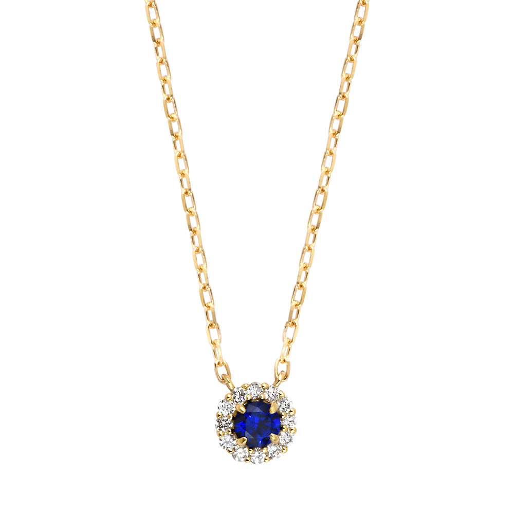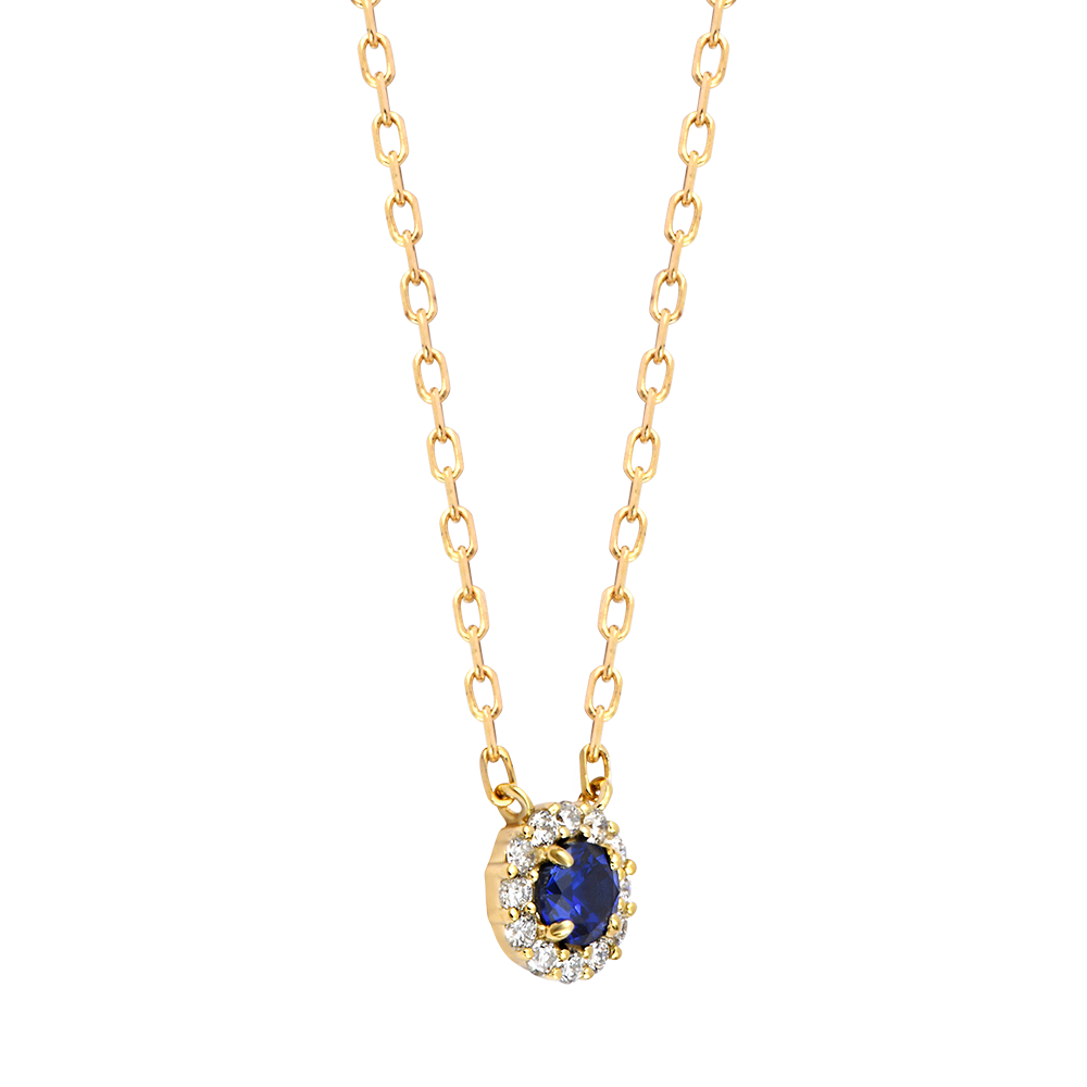 Este delicado collar presenta un zafiro sintético intenso, rodeado de doce diamantes sintéticos brillantes que crean un halo luminoso de encanto atemporal.