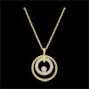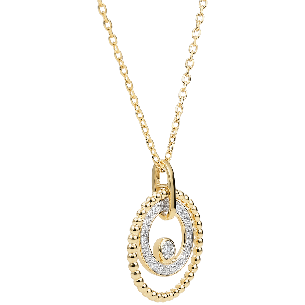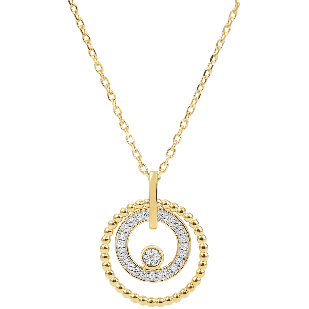 Un circulo de perlas de oro enmarcados por un circulo de diamantes y un solitario en su centro.