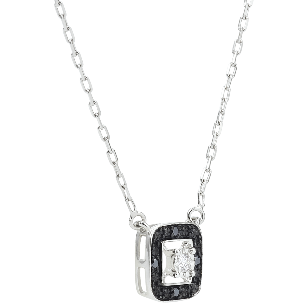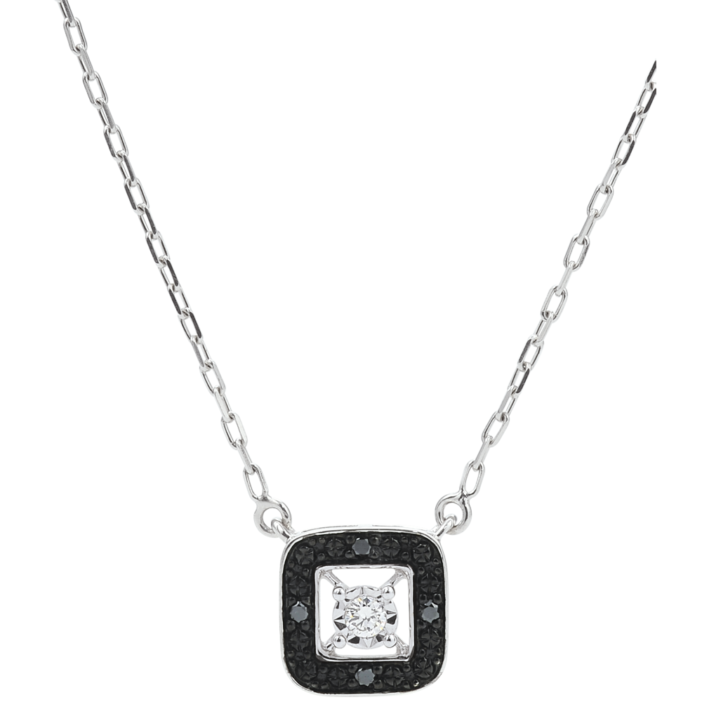 Espléndido Collar Claroscuro con un cuadrado de oro blanco estructurado alrededor de un diamante blanco y acompañado de diamantes negros, lo que le da un look chic moderno.