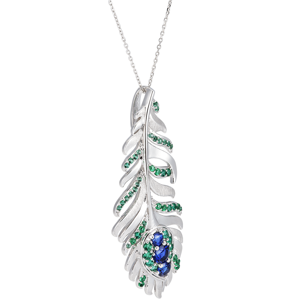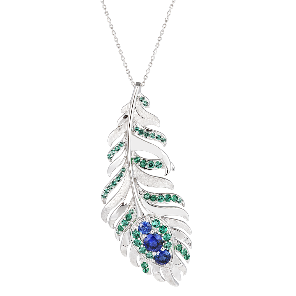 El collar Altesa en oro blanco de 18 quilates se distingue por su motivo de pluma adornado con 50 esmeraldas y zafiros sintéticos. Con una longitud de cadena de 45 cm, este collar añade un toque de elegancia y sofisticación a tu escote, recordando el esplendor del pavo real.