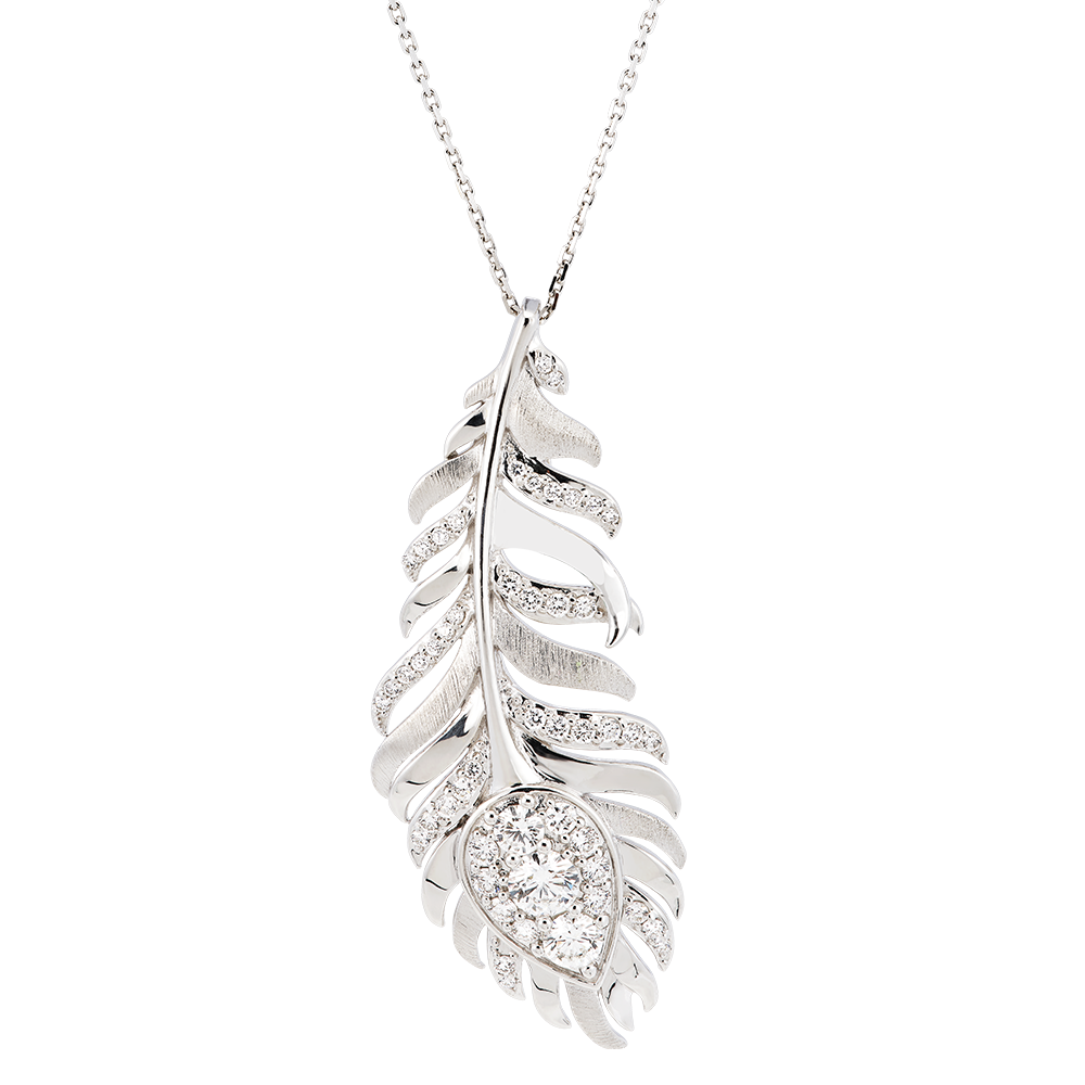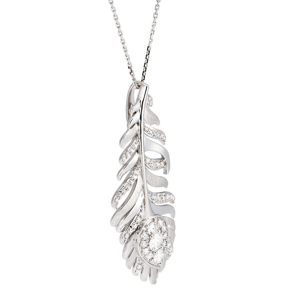 El collar Altesa en oro blanco de 9 quilates se distingue por su motivo de pluma adornado con 50 diamantes sintéticos brillantes. Con una longitud de cadena de 45 cm, este collar añade un toque de elegancia y sofisticación a tu escote, recordando el esplendor del pavo real.