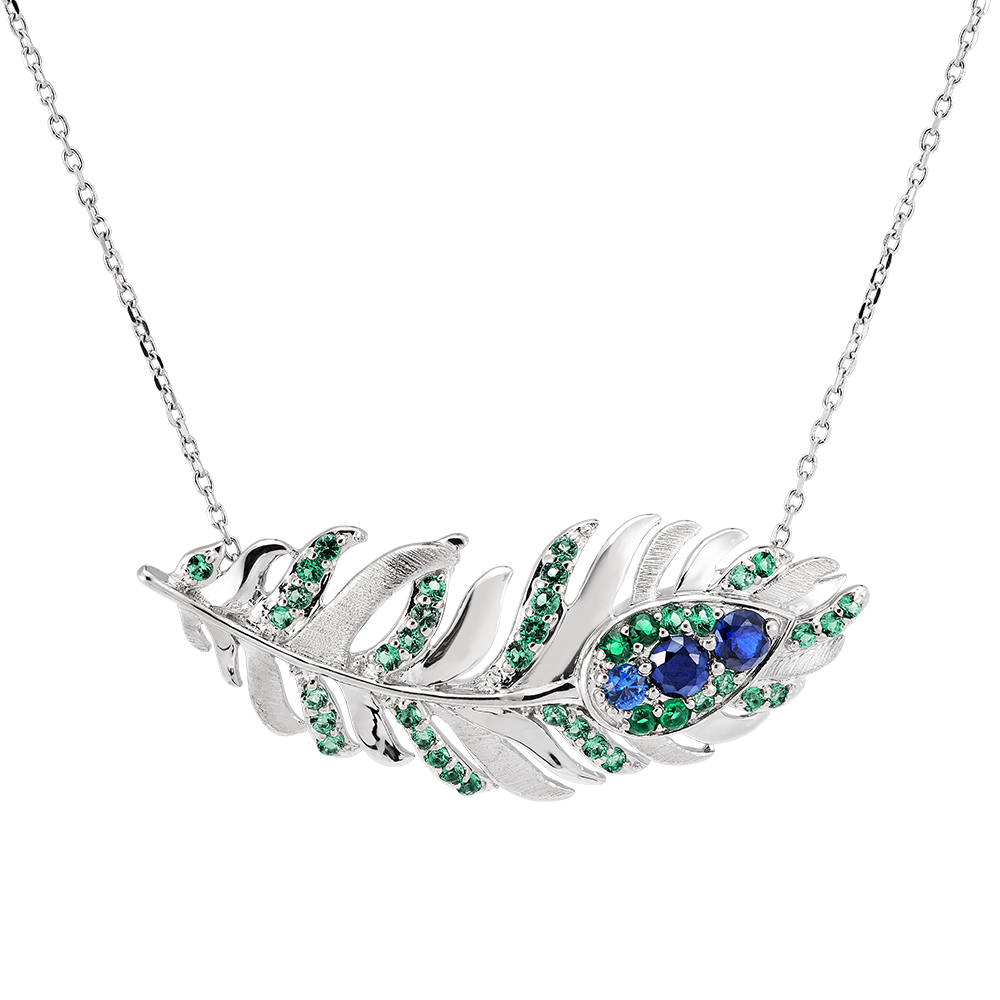El collar Signature en oro blanco de 9 quilates luce un elegante colgante con motivo de pluma, adornado con 44 esmeraldas y zafiros sintéticos. Una pieza refinada que captura la esencia aérea y el refinamiento inigualable de las plumas, la firma de la colección Panache.