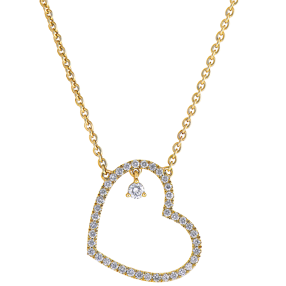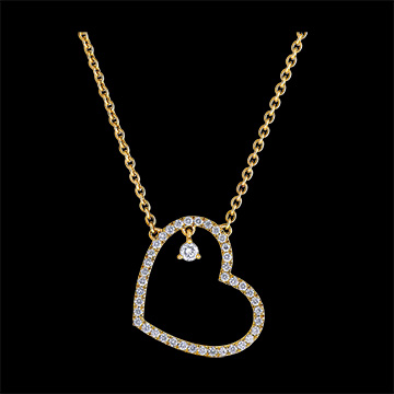Un delicado corazón de oro amarillo engastado con diamantes que lleva en su centro un amuleto de diamante que brilla con cada movimiento del collar. Con una cadena de 45 cm de largo y una argolla de ajuste de 42 cm.