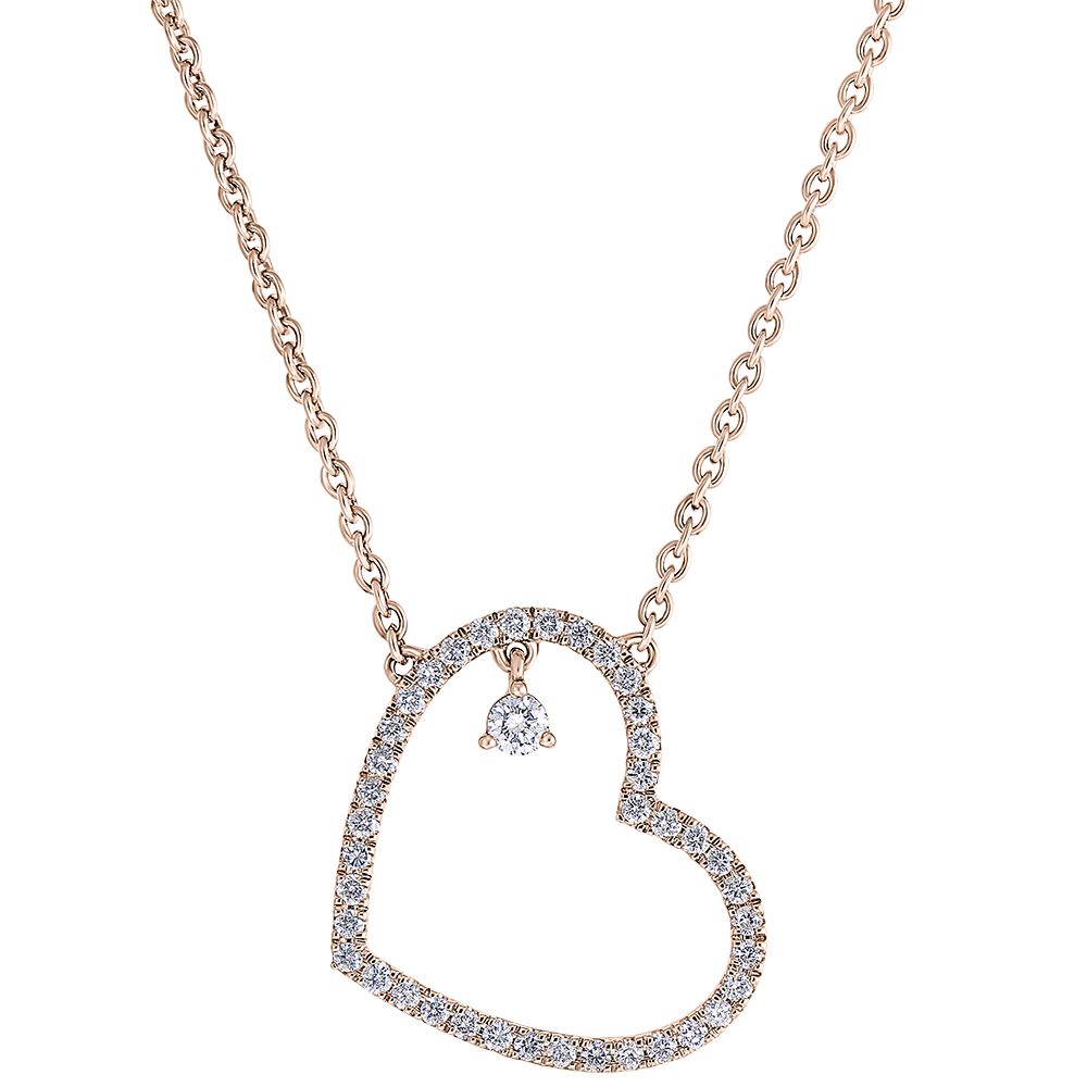 Un delicado corazón de oro rosa engastado con diamantes que lleva en su centro un amuleto de diamante que brilla con cada movimiento del collar. Con una cadena de 45 cm de largo y una argolla de ajuste de 42 cm.