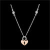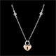 Un corazón de oro rosa, portador de una cerradura en su centro, está montado sobre una cadenita de oro blanco adornada con dos diamantes brillantes. Pulsera de longitud ajustable: 18 cm, 17 cm, 16 cm. Motivo de 8 mm de largo y 11 mm de alto.