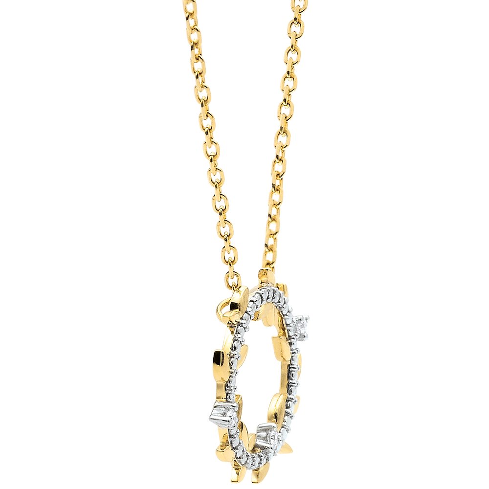 Hojas de oro amarillo brillantes y hojas de oro de acabado rugoso hechas a mano se alternan para crear un collar romántico con 6 diamantes.