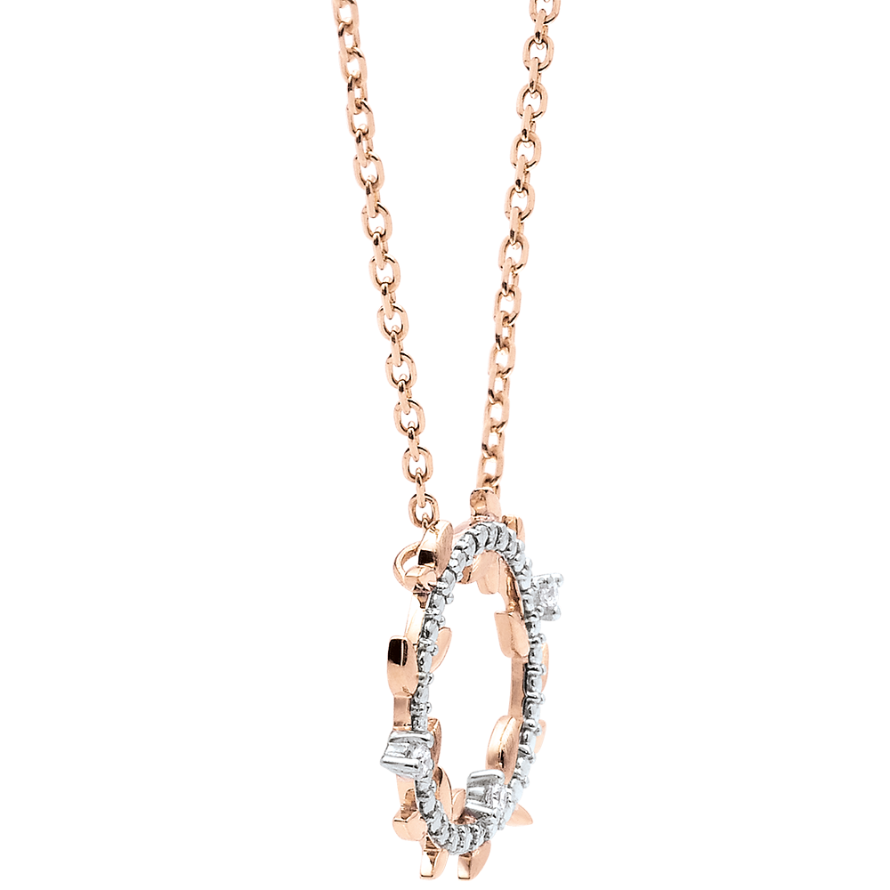 Hojas de oro rosa brillantes y hojas de oro de acabado rugoso hechas a mano se alternan para crear un collar romántico con 6 diamantes.